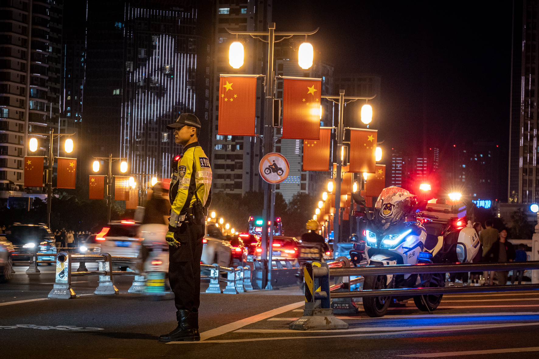 10月2日晚,四川省綿陽市公安局交警支隊執(zhí)勤民警在越王樓景區(qū)附近疏導交通。