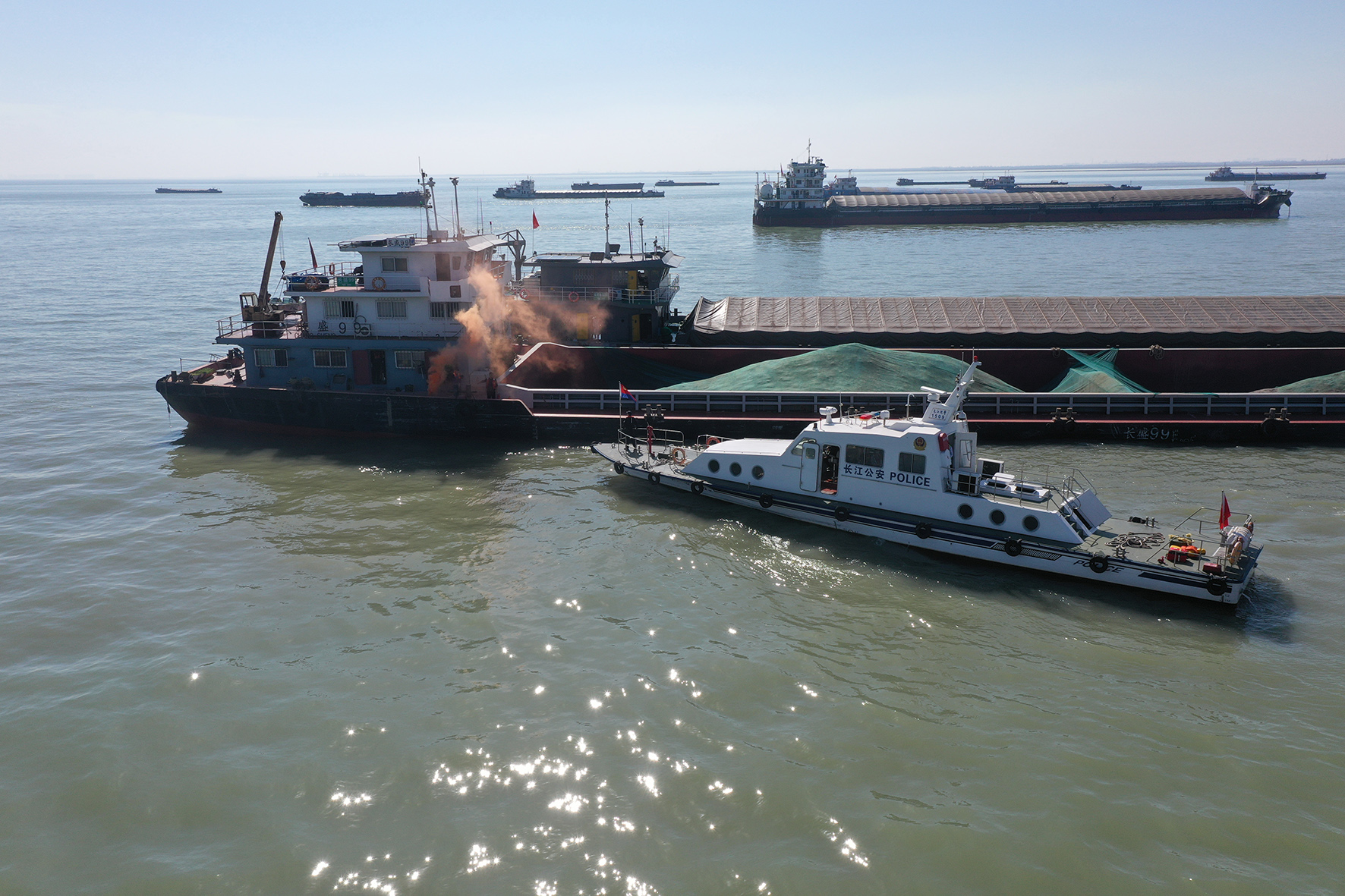 圖為演練中,公安艇向失火船舶靠近進(jìn)行滅火救援。