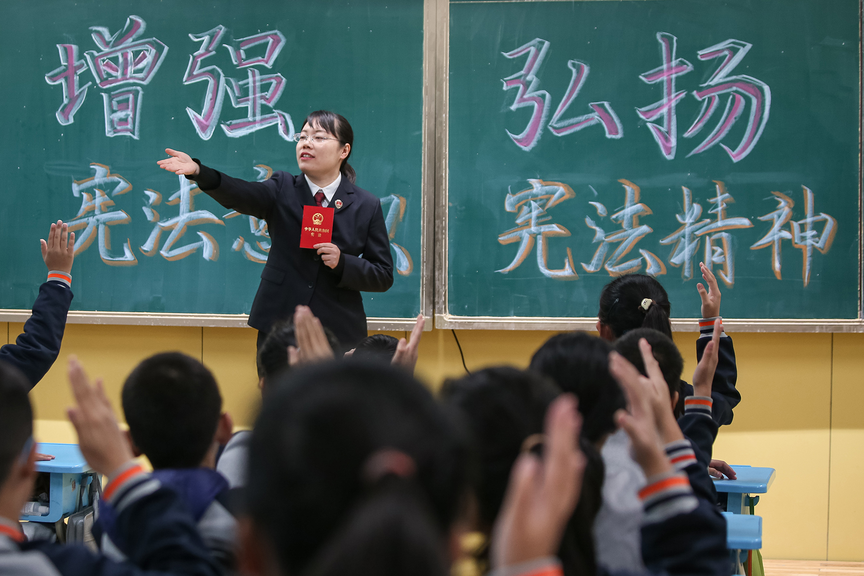 12月4日,陜西省渭南市中級人民法院組織法官走進轄區(qū)中小學,開展憲法宣傳進校園活動。