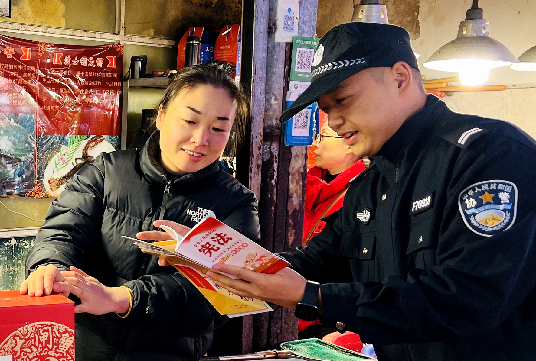 12月4日,浙江省臺州市天臺縣公安局民輔警走進農(nóng)貿市場開展憲法宣傳活動。