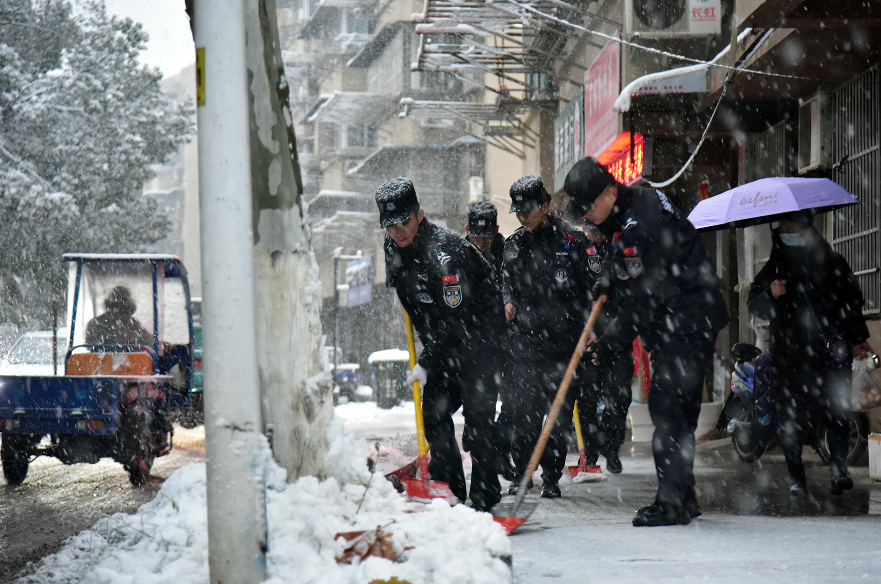 12月18日,安徽省當涂縣突降大雪。當涂縣公安局第一時間成立了黨員突擊隊,迅速投入到河濱路鏟雪一線,確保路面安全。
