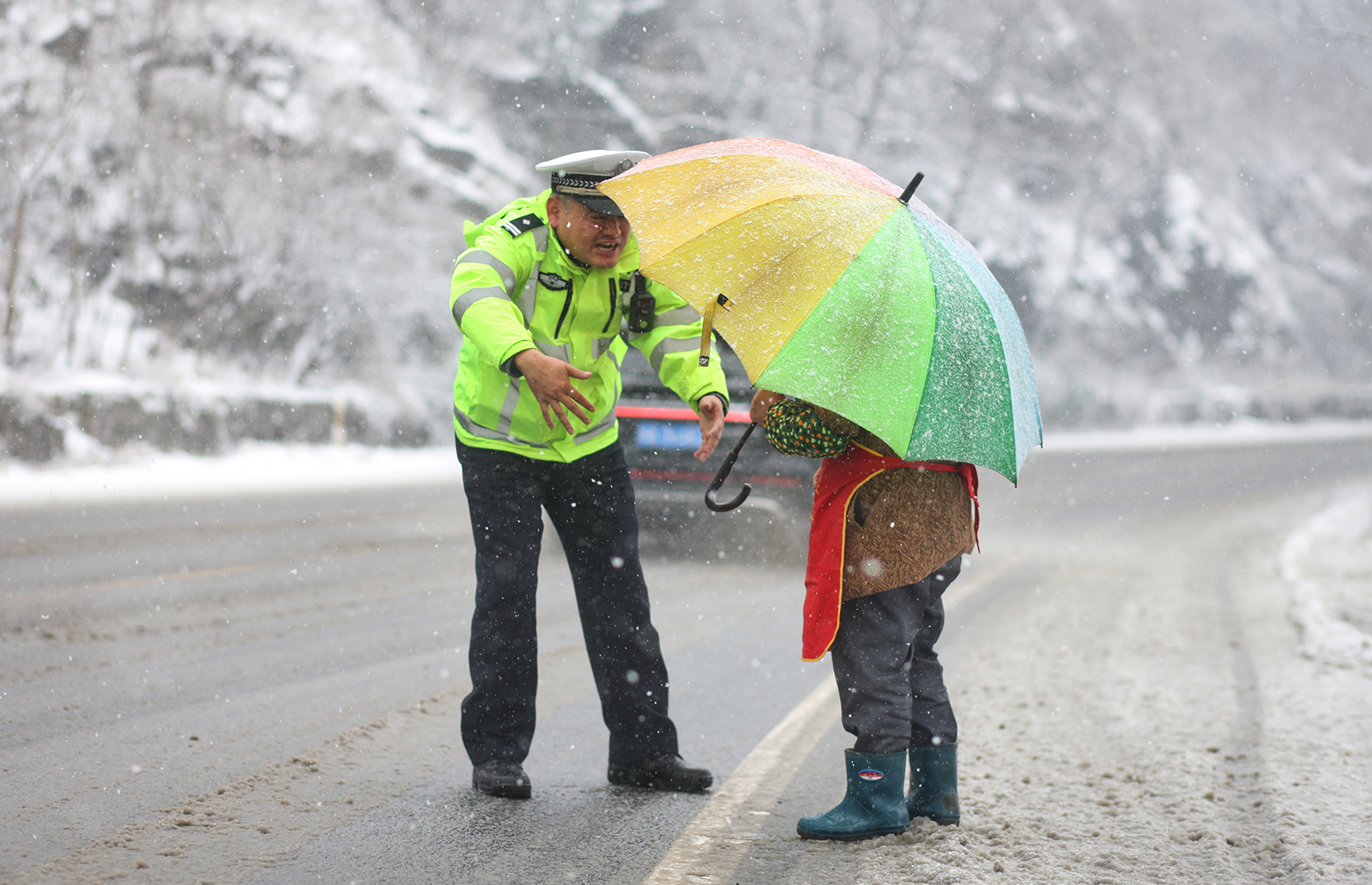 12月18日,安徽省巢湖市公安局交警大隊民警提示一名老年人雪天過馬路注意交通安全,并將其安全護送過馬路。