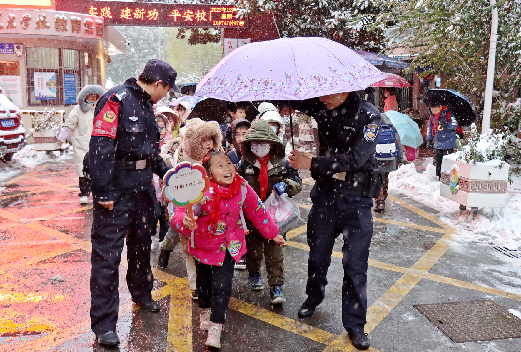12月18日,安徽省合肥市公安局瑤海分局民輔警加強“護學(xué)”模式,為雪天出行的廣大師生“保駕護航”。