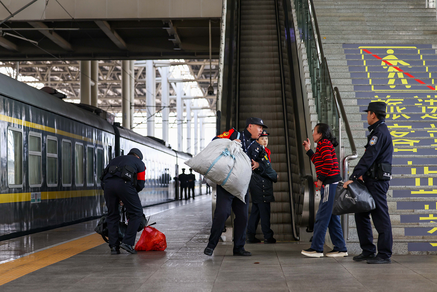 2023年12月31日,成都鐵路公安局貴陽公安處乘警支隊(duì)民警幫助旅客搬運(yùn)行李。