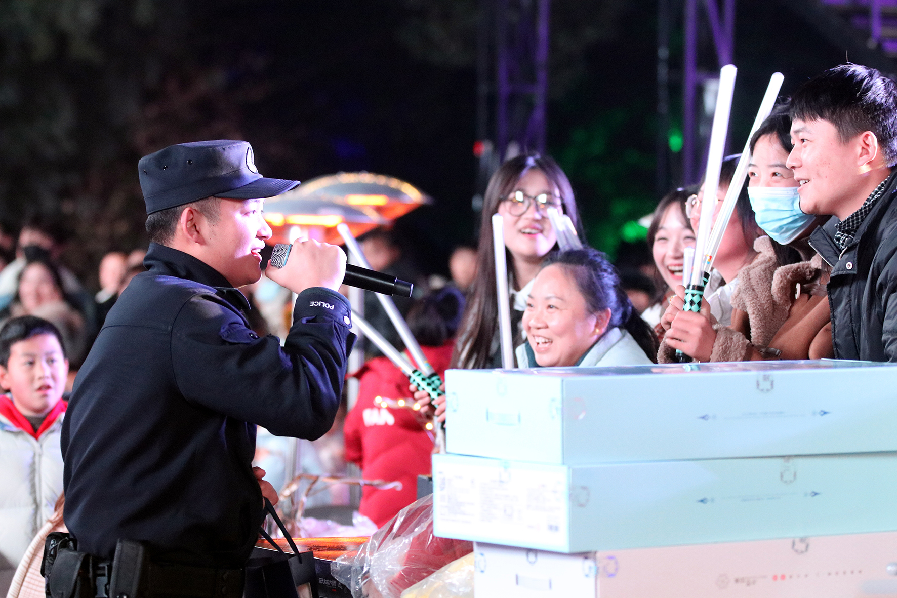 2023年12月31日,安徽省蕪湖市方特景區(qū)舉行大型跨年夜慶祝活動。蕪湖市公安局民警現(xiàn)場與游客互動,宣傳反詐、交通等安全知識。