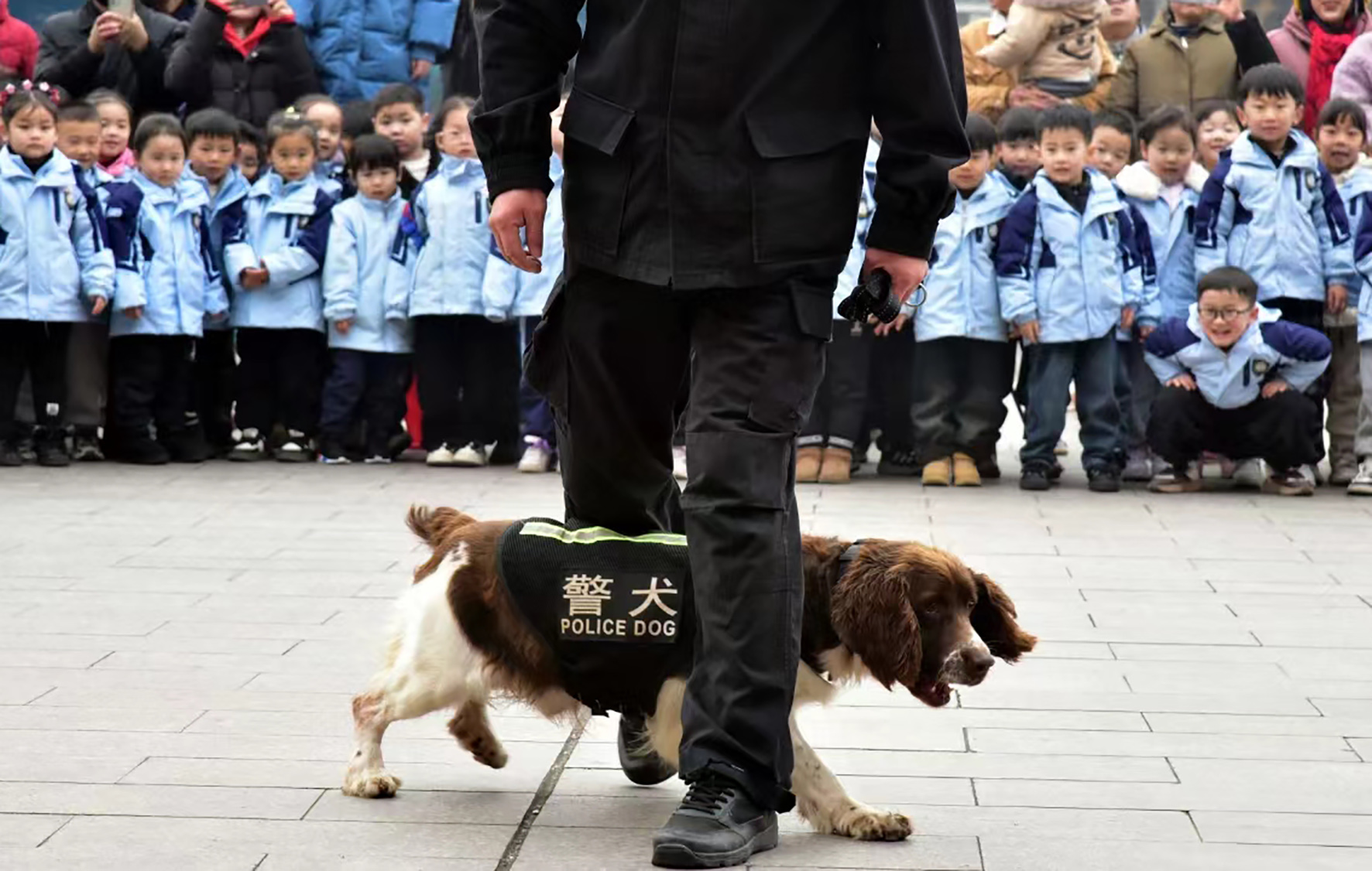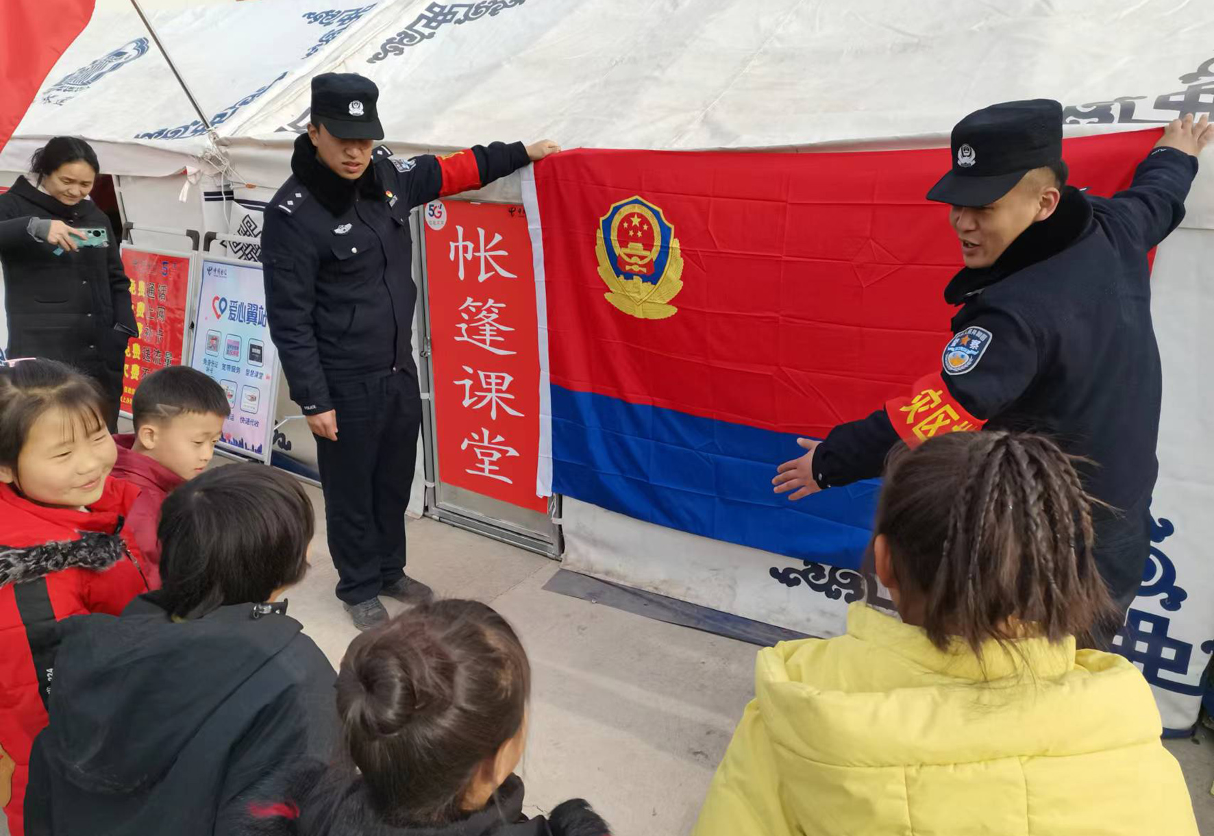 1月10日上午,在甘肅省積石山縣大河家鎮(zhèn)大河村“抗震前線110”警務(wù)室,永靖縣公安局支援民警給小學(xué)生們上一堂警察節(jié)知識(shí)課。