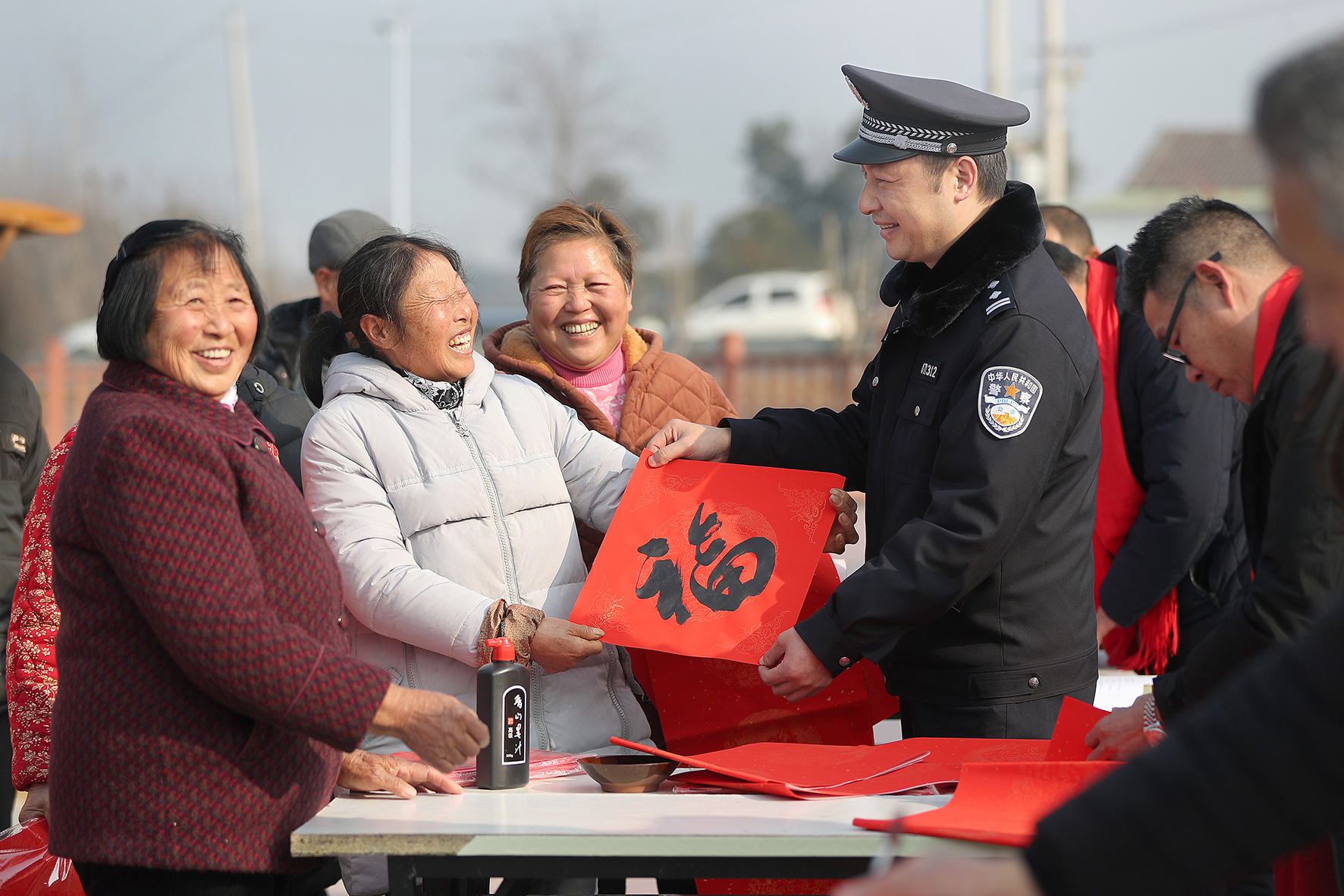 1月12日,在湖北省掇刀區(qū)團林鋪鎮(zhèn)合星村,荊門市公安局高新區(qū)·掇刀區(qū)分局團林派出所民警向村里老人送上“平安福”。