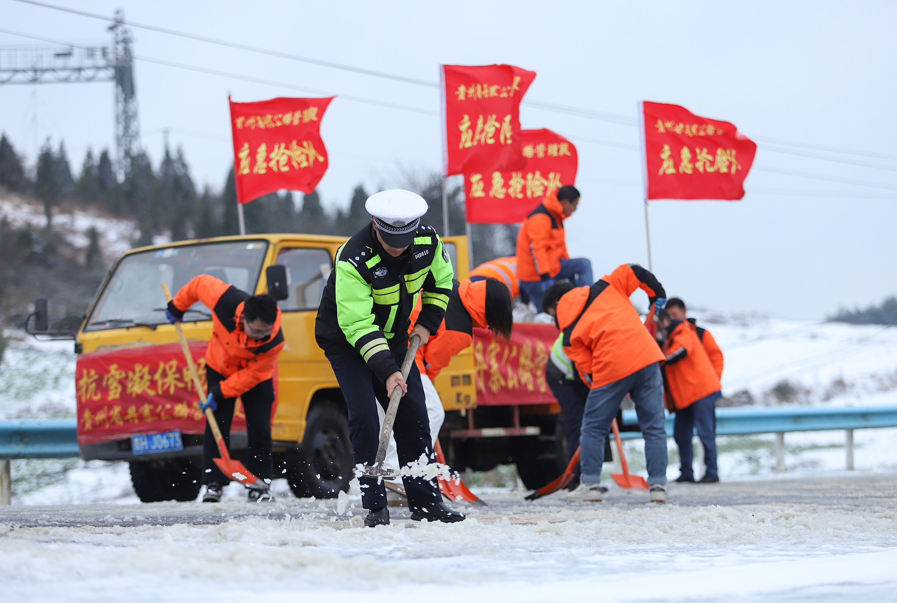 1月22 日,貴州省黔東南苗族侗族自治州丹寨縣交警部門會同相關(guān)部門對凝凍路段進行融冰除雪作業(yè),及時恢復(fù)道路正常通行,確保群眾出行安全。