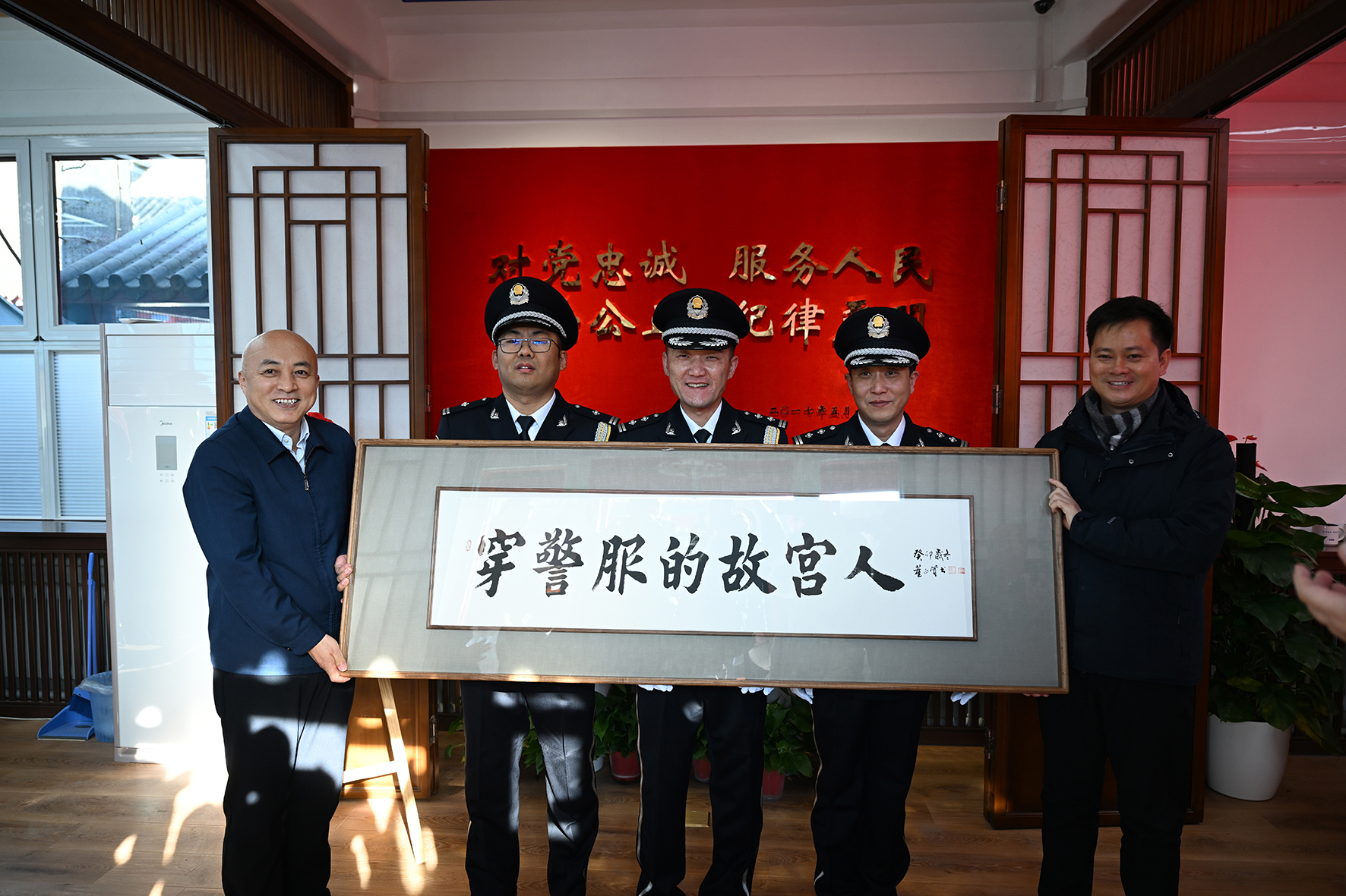 1月10日,第四個中國人民警察節(jié)。文化和旅游部黨組成員、故宮博物院院長王旭東(左一)看望慰問故宮派出所民警,并將“穿警服的故宮人”牌匾送到民警手中。