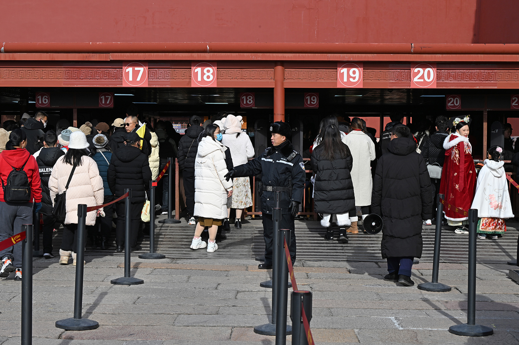 民警在進(jìn)入午門的安檢通道前維持秩序。