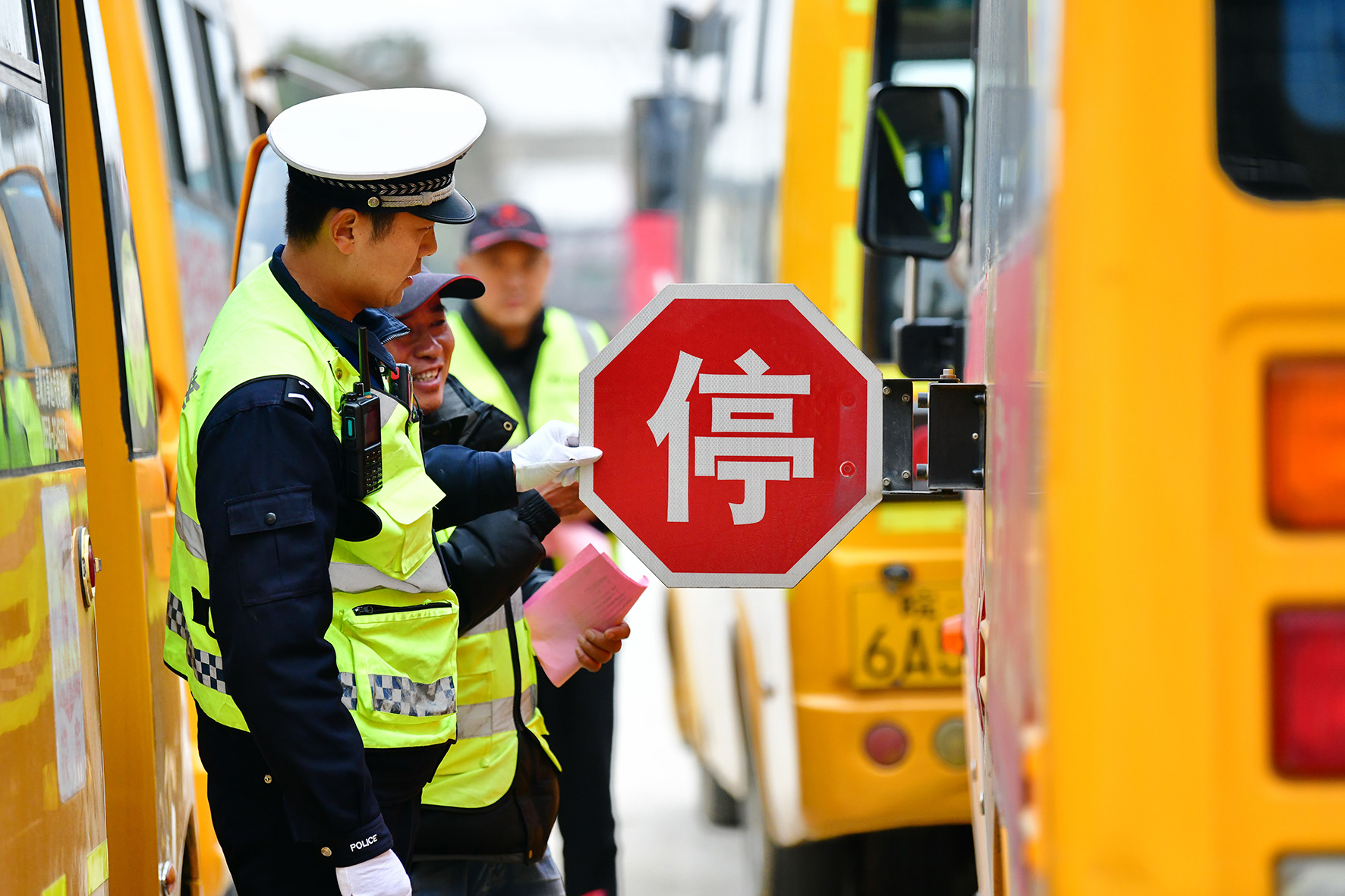 2月19日,安徽省阜南縣公安局交管大隊(duì)民警在檢查校車安全設(shè)施。開(kāi)學(xué)臨近,阜南縣公安局交管大隊(duì)組織民警對(duì)全縣各中小學(xué)校校車進(jìn)行全面檢查,保障學(xué)生乘車安全。