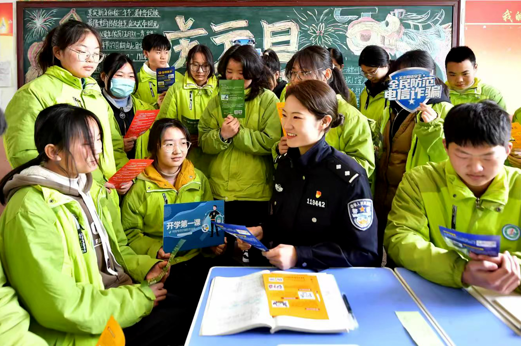 2月26日,山東省棗莊市公安局臺兒莊分局組織民警走進轄區(qū)中小學校,開展“開學反詐第一課”宣傳活動。