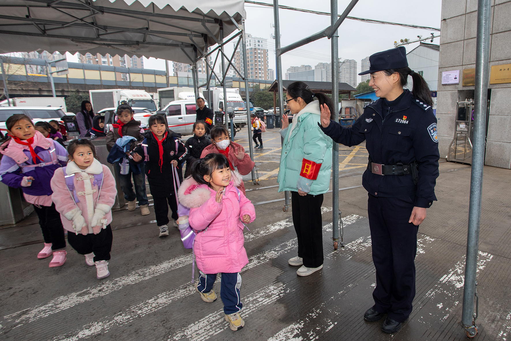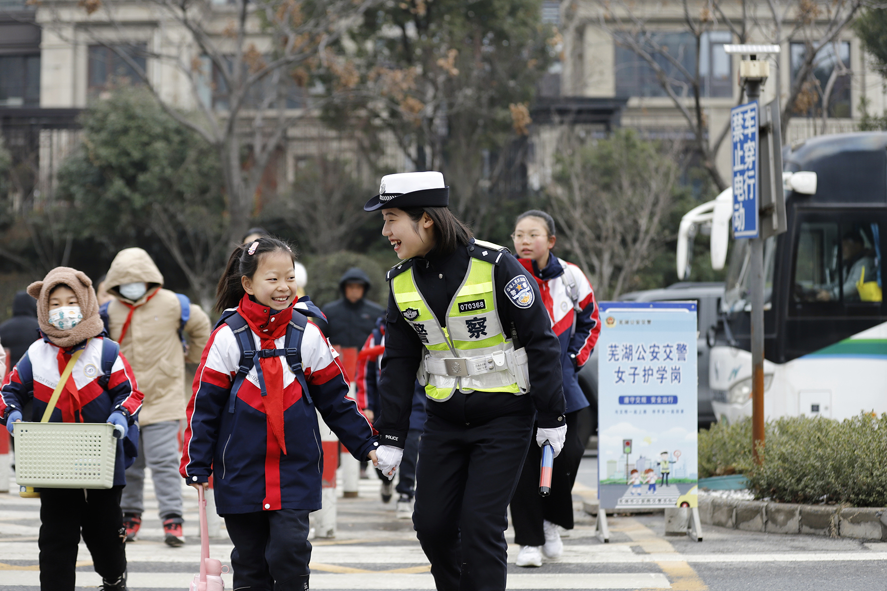 2月26日,安徽省蕪湖市弋江大隊女子護學崗民警在安師大附屬小學(西校區(qū))護送上學孩子過馬路,確保學生上放學安全。