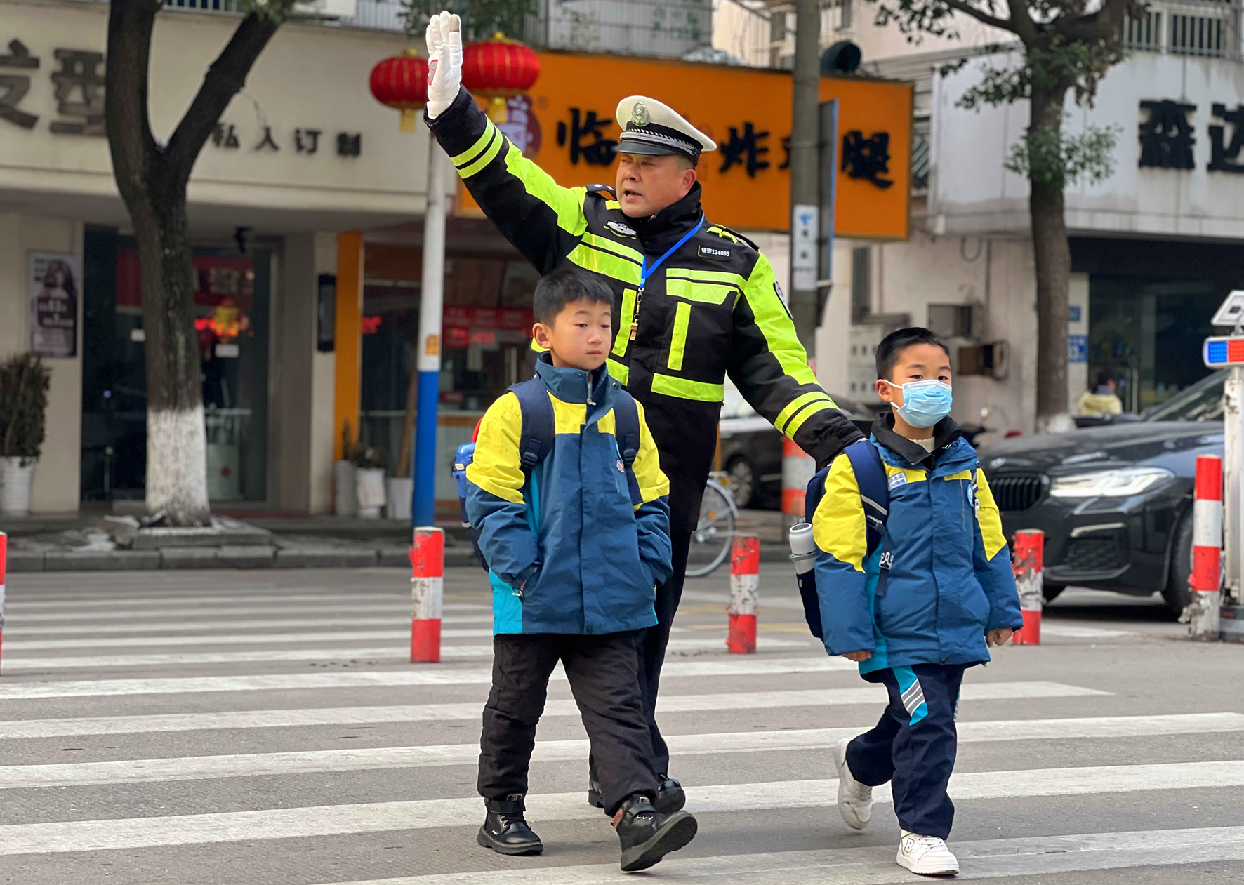 2月26日,安徽省當涂縣公安局交管大隊民警在團結街小學護送學生過斑馬線。