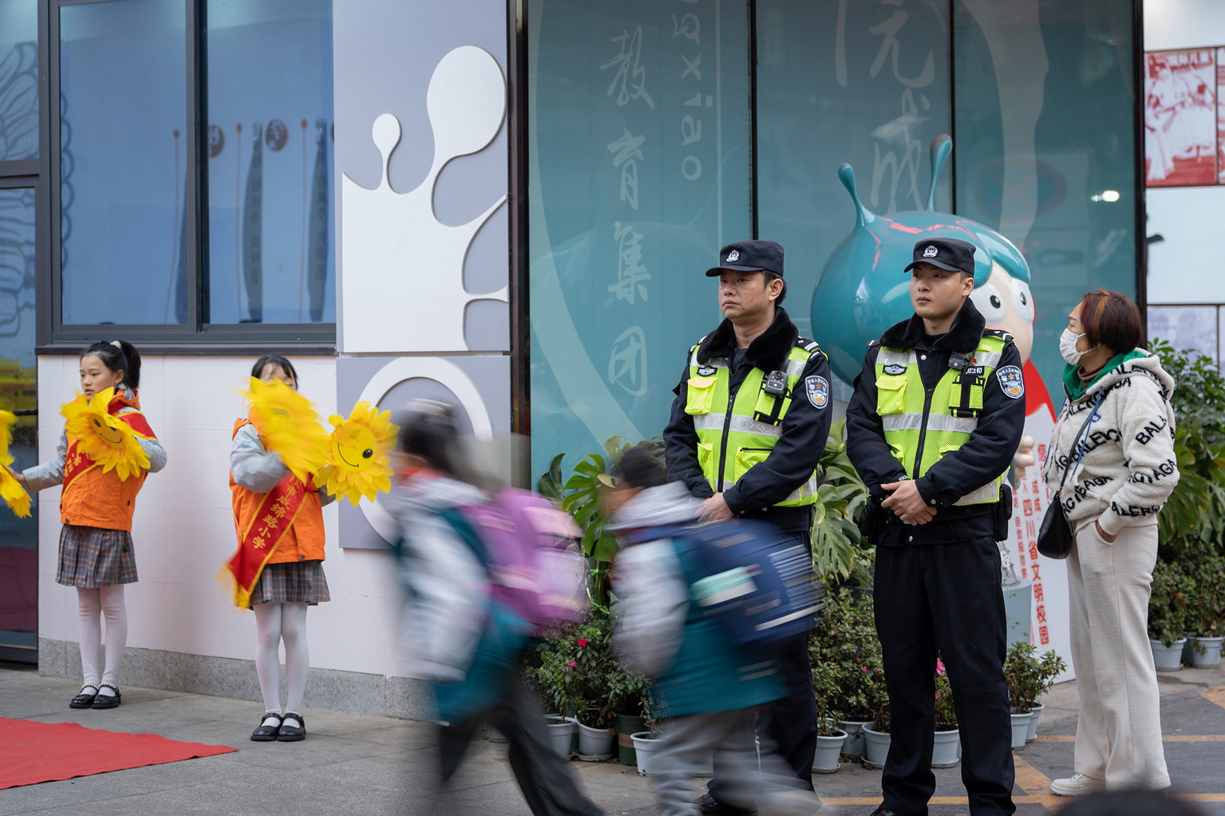 2月26日,開學第一天。浙江省臺州市公安局黃巖分局各派出所民警走上“護學崗”,加大巡邏管控力度、維持校園周邊秩序。
