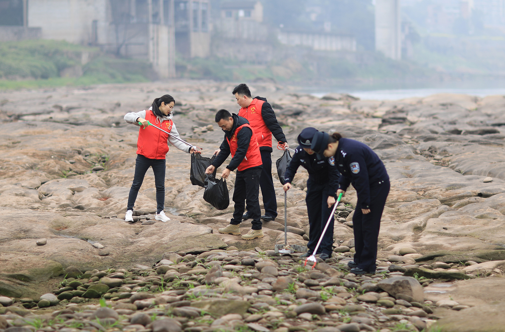 圖為民警和黨員志愿者在赤水河岸邊清理垃圾。