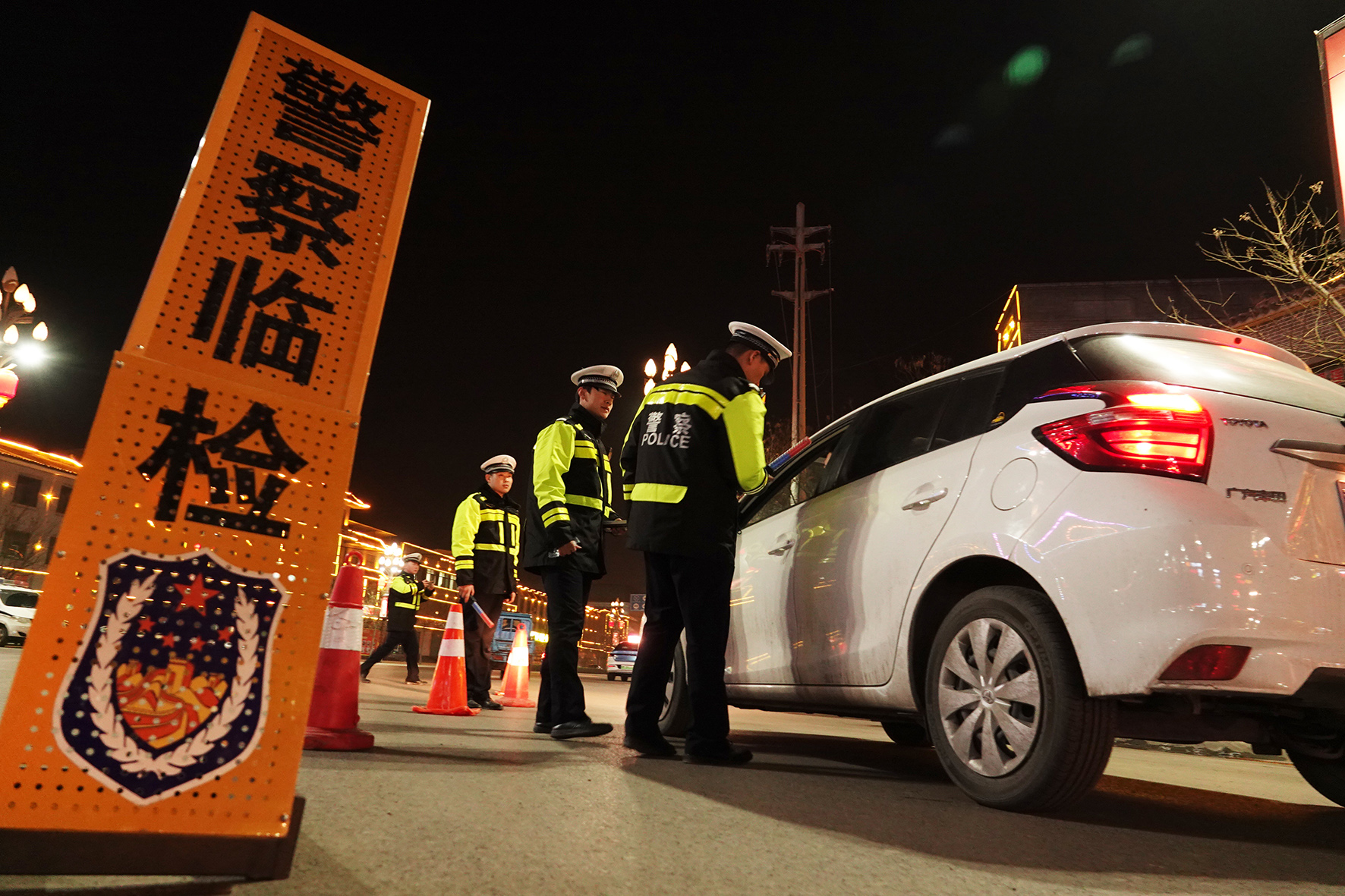3月6日,山西省運(yùn)城市新絳縣交警大隊(duì)民輔警在108國(guó)道入城三岔口夜查酒駕。