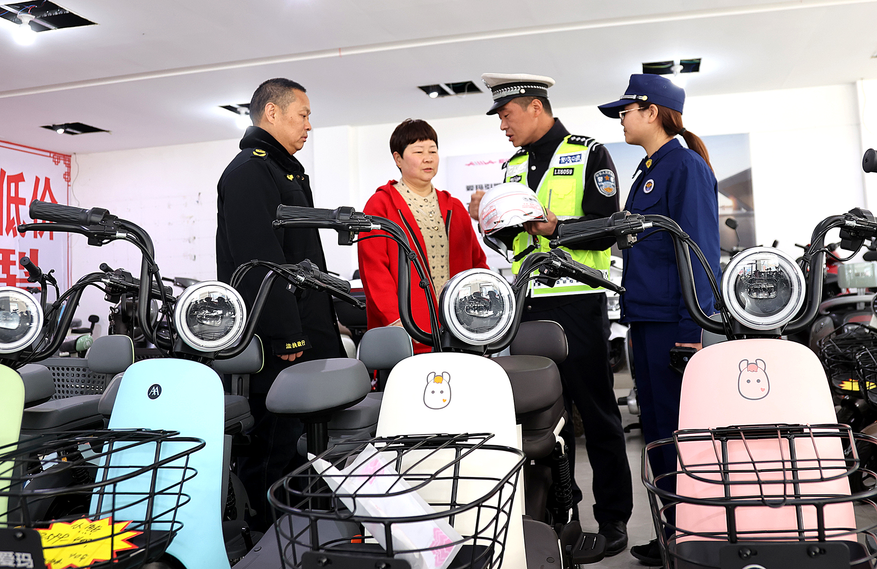 3月14日,陜西省大荔縣公安局交警大隊(duì)聯(lián)合市場(chǎng)監(jiān)管局、消防大隊(duì),走進(jìn)轄區(qū)電動(dòng)車銷售點(diǎn)開展電動(dòng)車質(zhì)量安全和頭盔質(zhì)量等宣傳檢查。