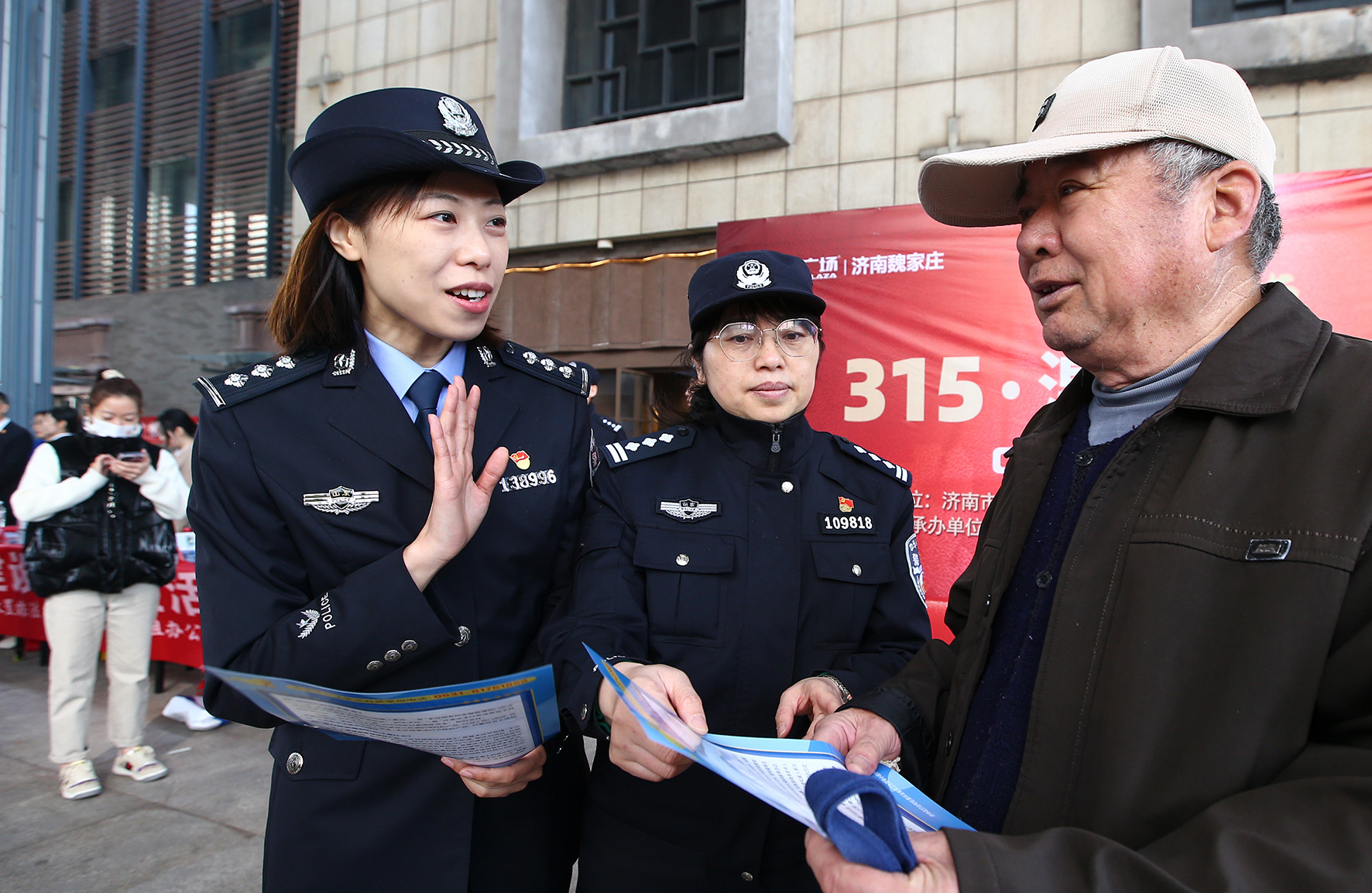 3月14日,在山東省濟(jì)南市經(jīng)四路萬(wàn)達(dá)廣場(chǎng),濟(jì)南市公安局市中區(qū)分局聯(lián)合市中區(qū)市場(chǎng)監(jiān)管局等相關(guān)單位開展迎接“3?15”國(guó)際消費(fèi)者權(quán)益日活動(dòng)。