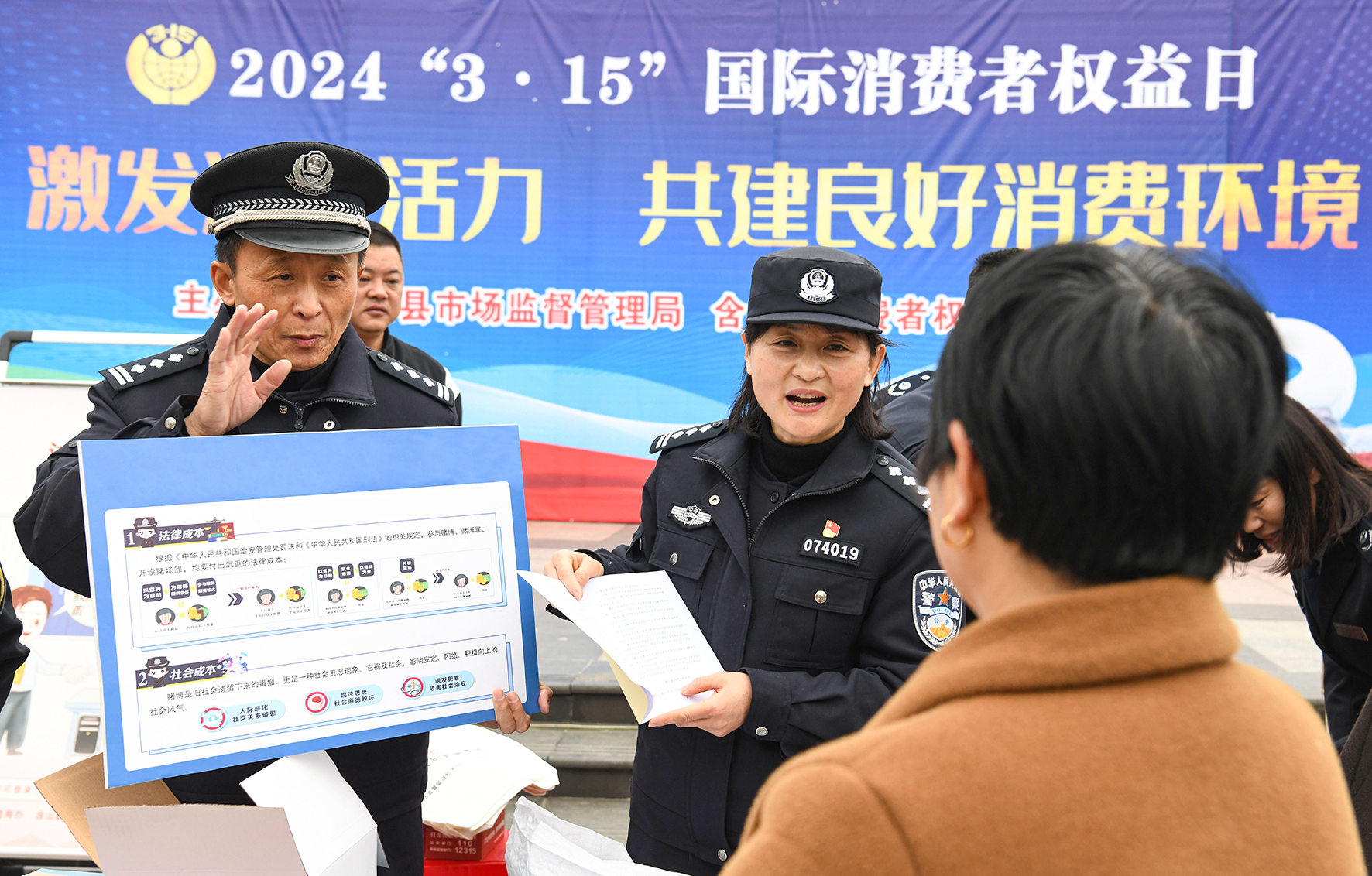 3月14日,安徽省含山縣公安局、市場(chǎng)監(jiān)督管理局等部門在玉龍廣場(chǎng)聯(lián)合開展“國(guó)際消費(fèi)者權(quán)益日”宣傳活動(dòng)。