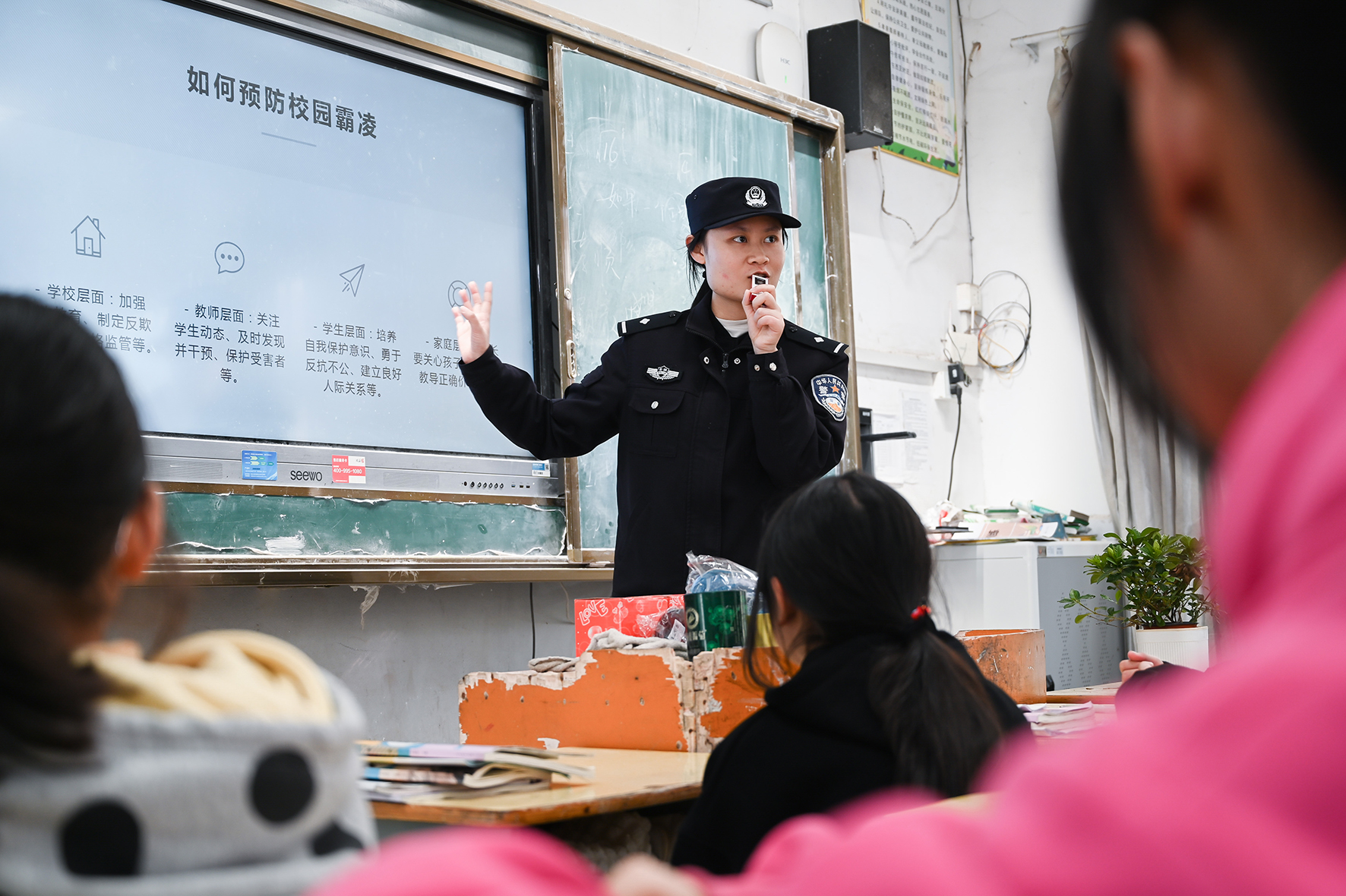 3月15日,安徽省馬鞍山市和縣公安局民警在石楊中學(xué)開展“拒絕校園霸凌”主題法治宣講,引導(dǎo)青少年樹立正確的人生觀和價值觀。
