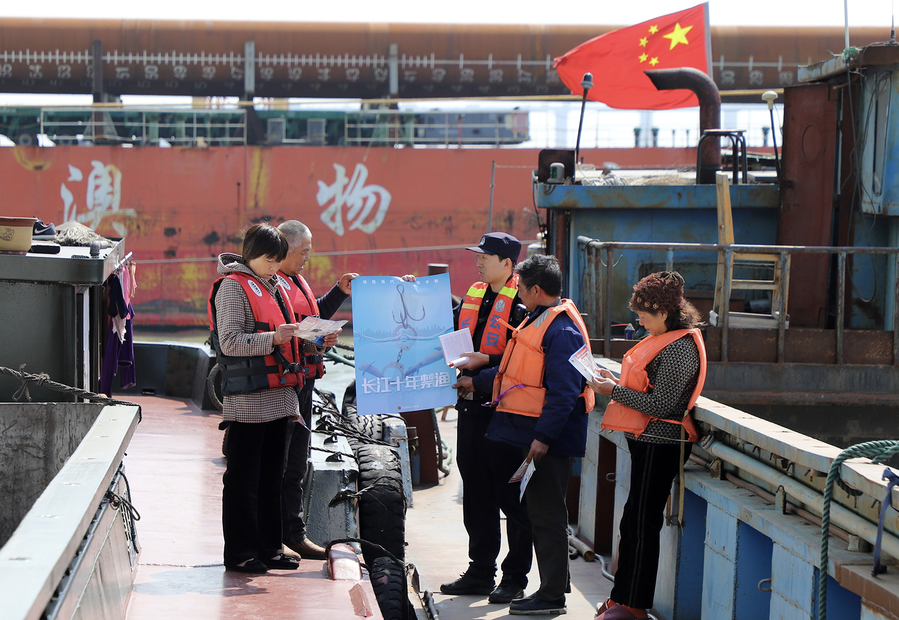 圖為民警來到長江刀鱭水產(chǎn)種質(zhì)資源保護區(qū),向船員開展普法教育宣傳。
