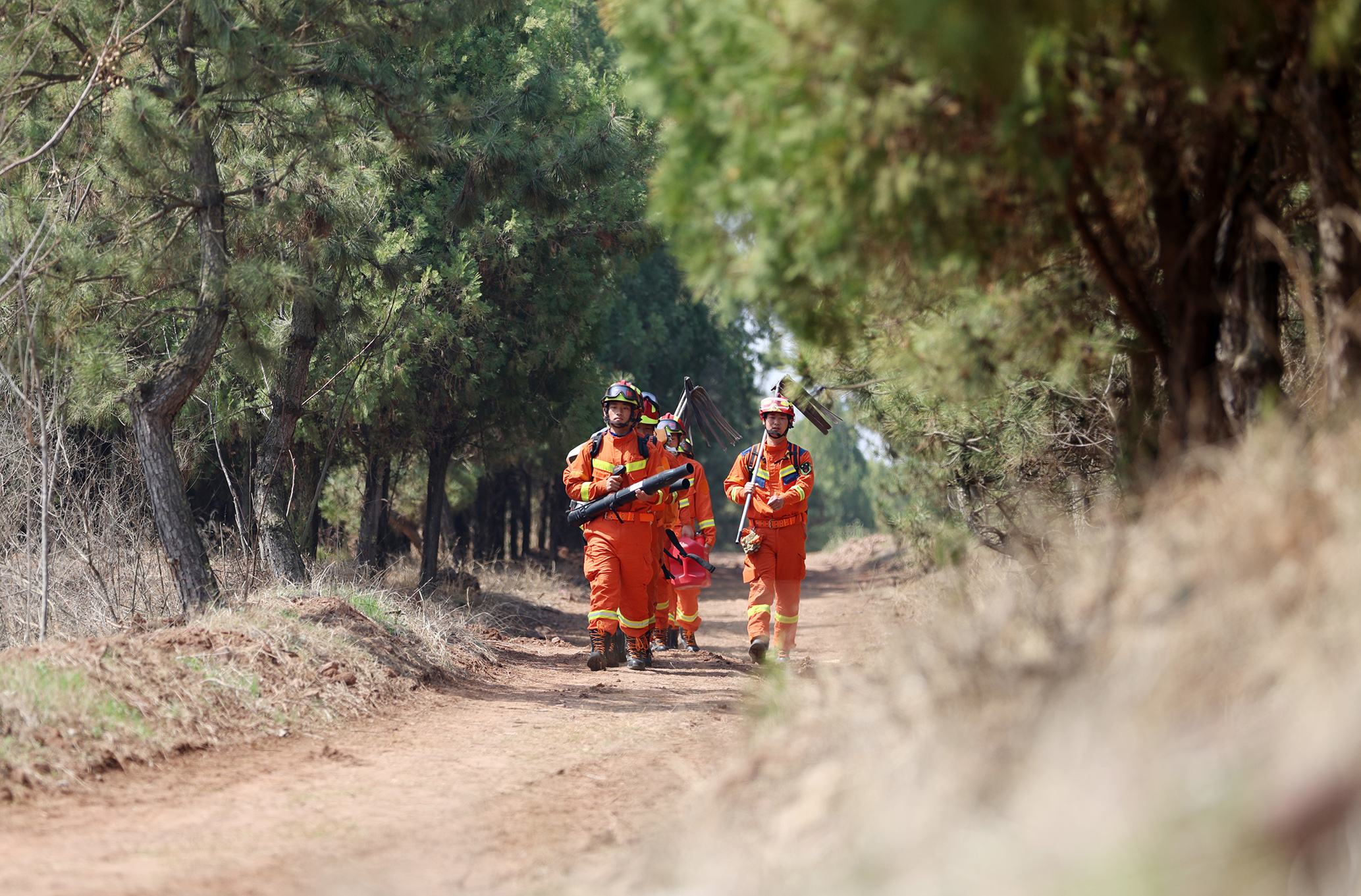 圖為4月1日,消防救援人員在郯城街道團山村林區(qū)巡邏。