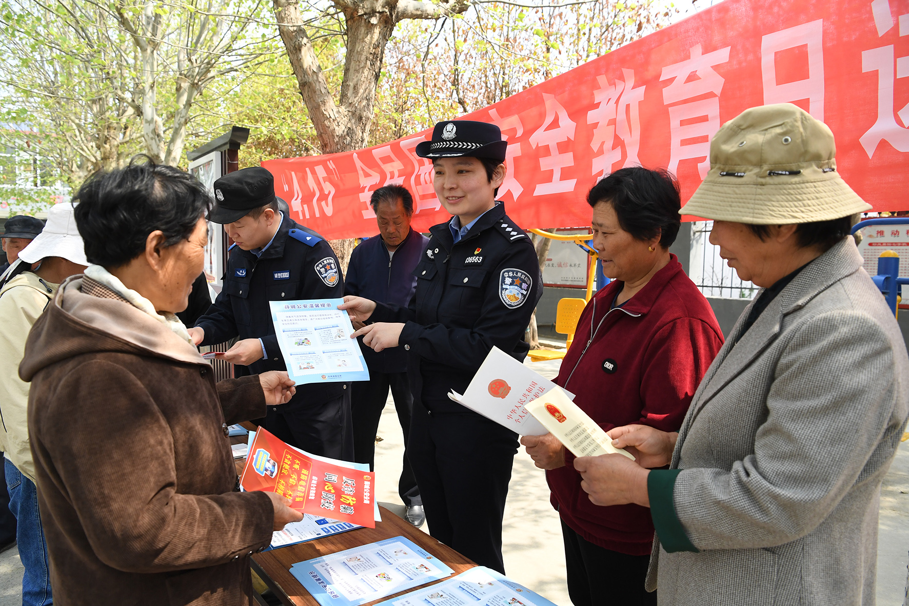 4月11日,山東省棗莊市公安局薛城分局鳳鳴湖派出所民輔警在轄區(qū)高樓社區(qū)全民國家安全教育日宣傳活動(dòng)。