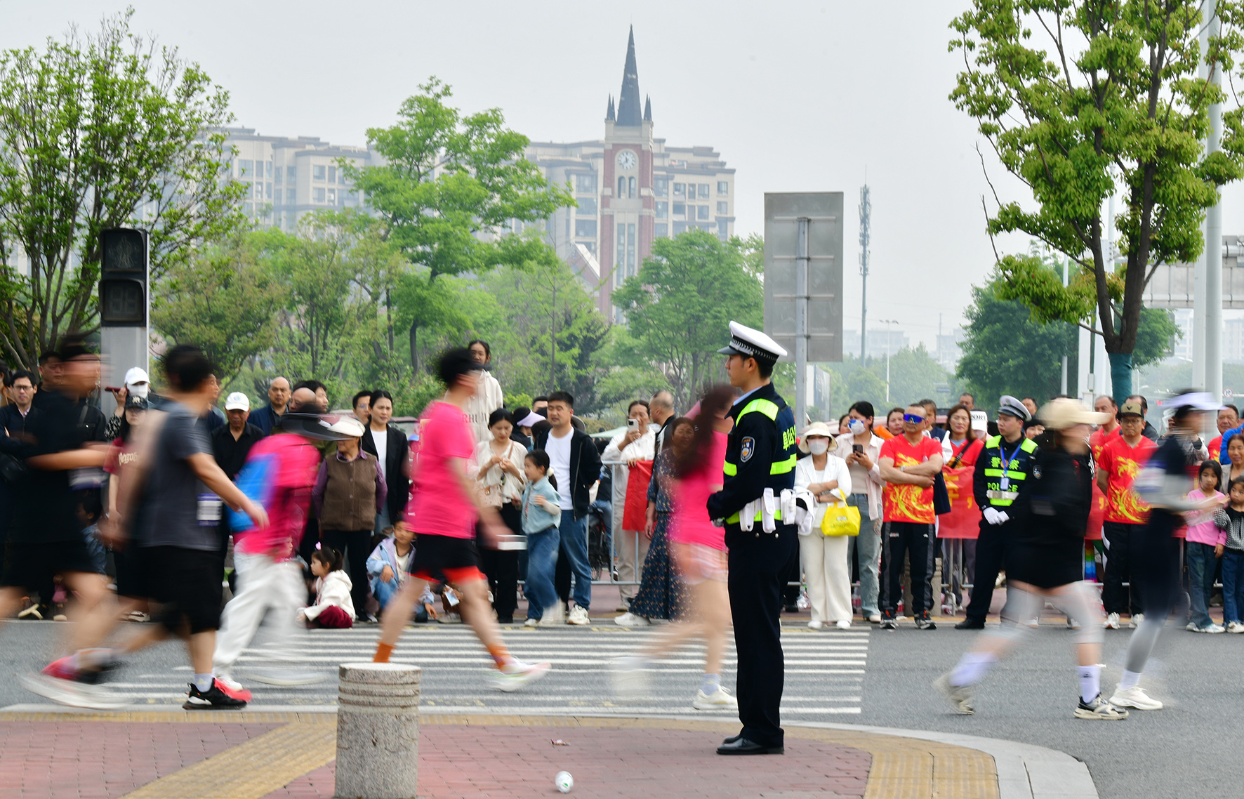 4月21日,安徽省阜陽市公安機(jī)關(guān)民輔警在阜陽馬拉松比賽現(xiàn)場(chǎng)維持秩序。