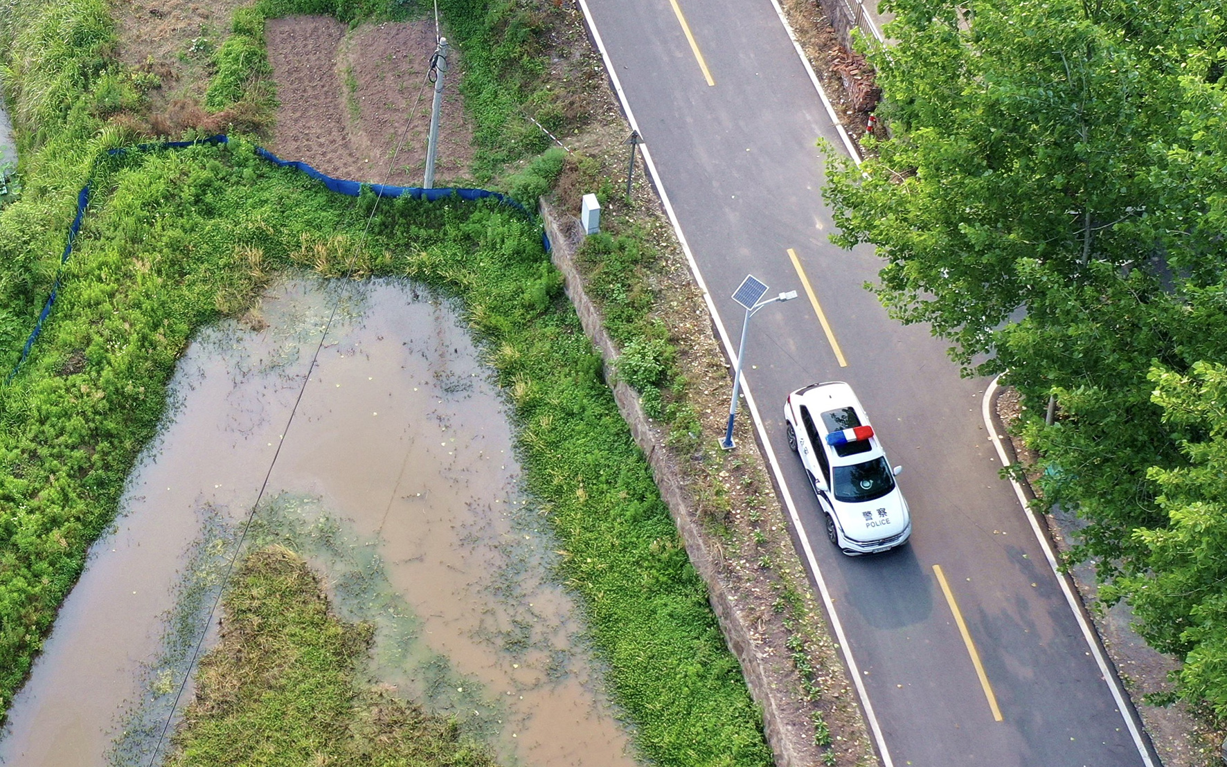 圖一、警車在美麗的村間公路上巡邏守護。
