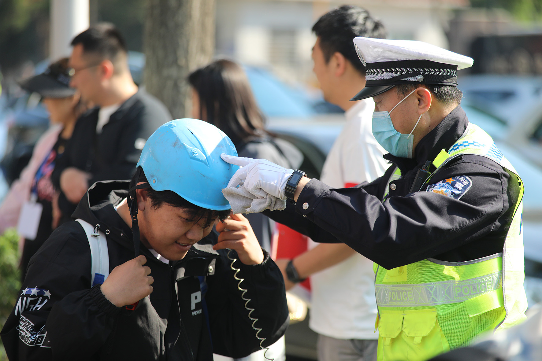 5月28日早高峰,遼寧省阜新市公安局局交警支隊(duì)細(xì)河大隊(duì)交警聯(lián)合民族街學(xué)校教師對(duì)騎乘電動(dòng)車不戴頭盔違規(guī)出行的學(xué)生進(jìn)行勸導(dǎo)教育。