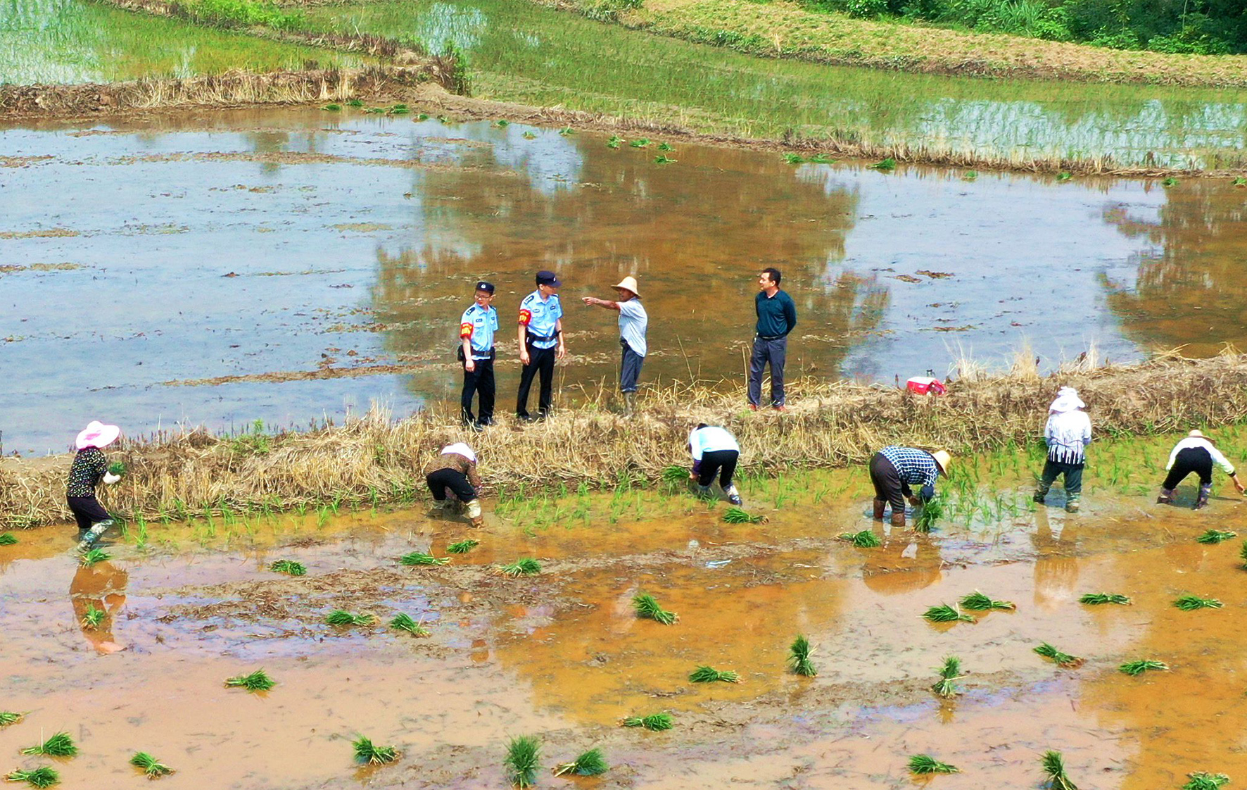 6月7日,安徽省舒城縣公安局張母橋派出所民警深入轄區(qū)農(nóng)林村田間,與栽種水稻秧苗的村民交流了解治安情況?!叭摹睍r節(jié),張母橋派出所民警以“田間警務”為著力點,深入田間地頭,開展巡邏、防范盜竊、現(xiàn)場化解糾紛等工作,為農(nóng)忙保駕護航。