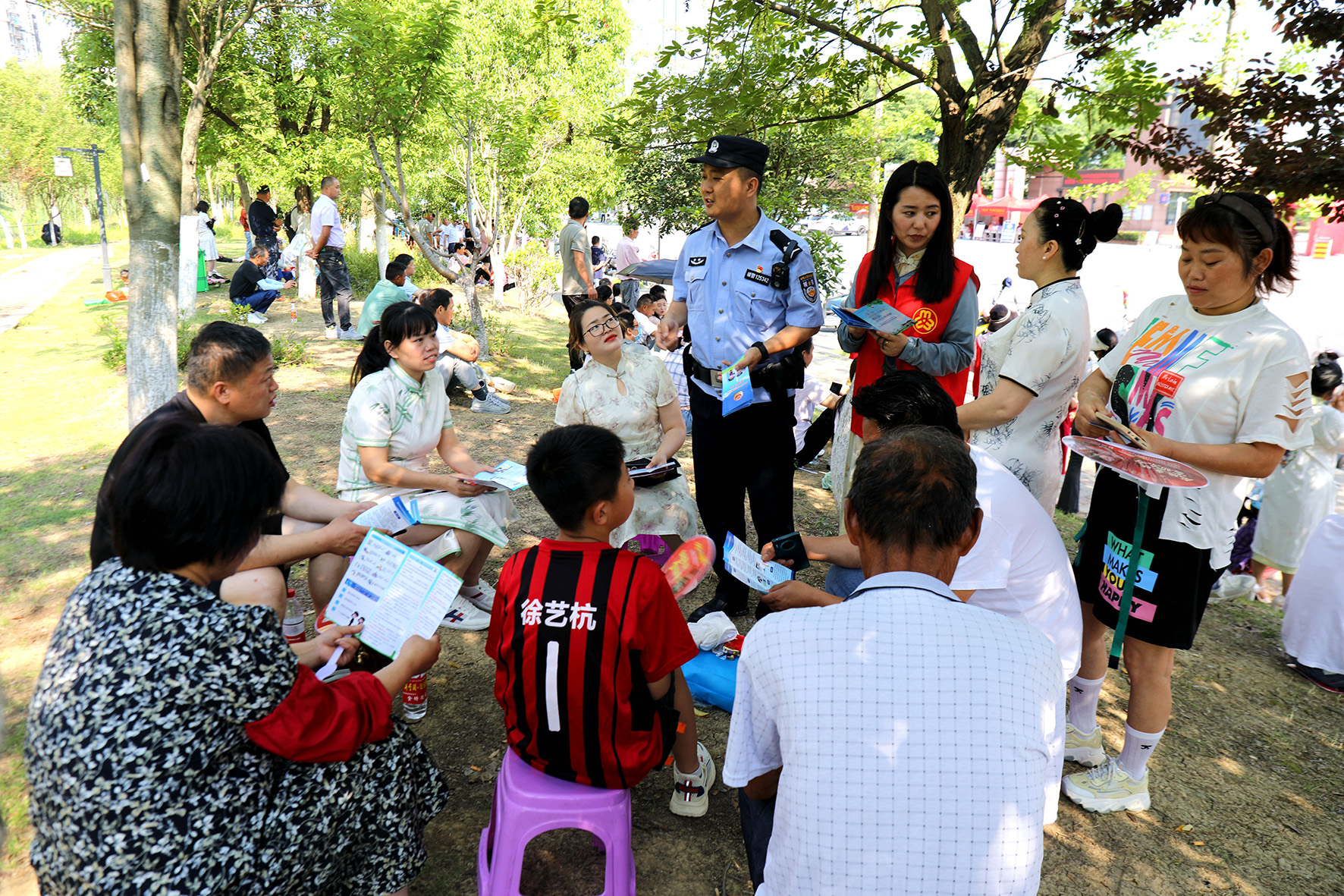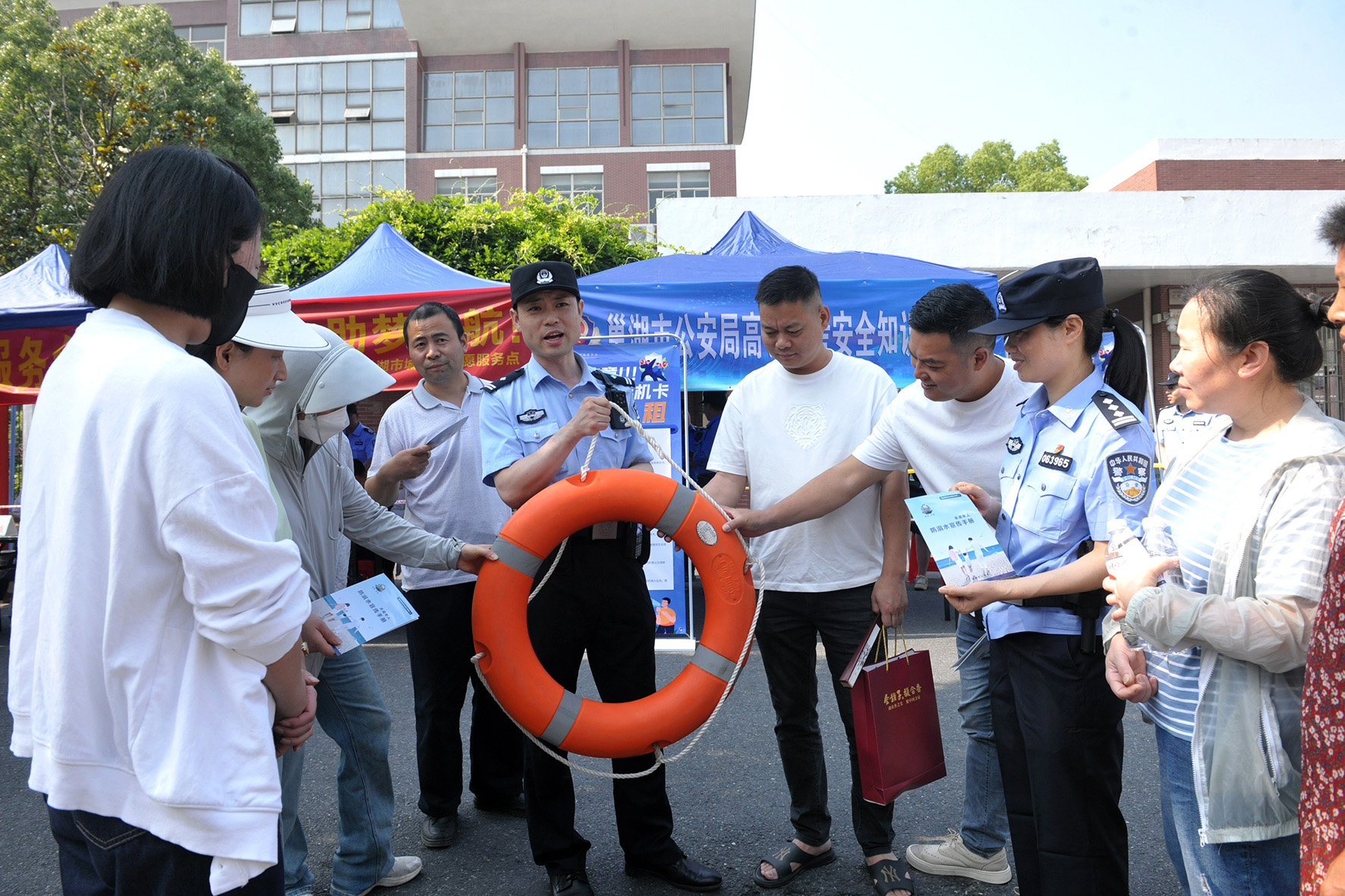 6月8日,安徽省巢湖市公安局高考宣傳點民警,向考生家長講解防溺水知識。