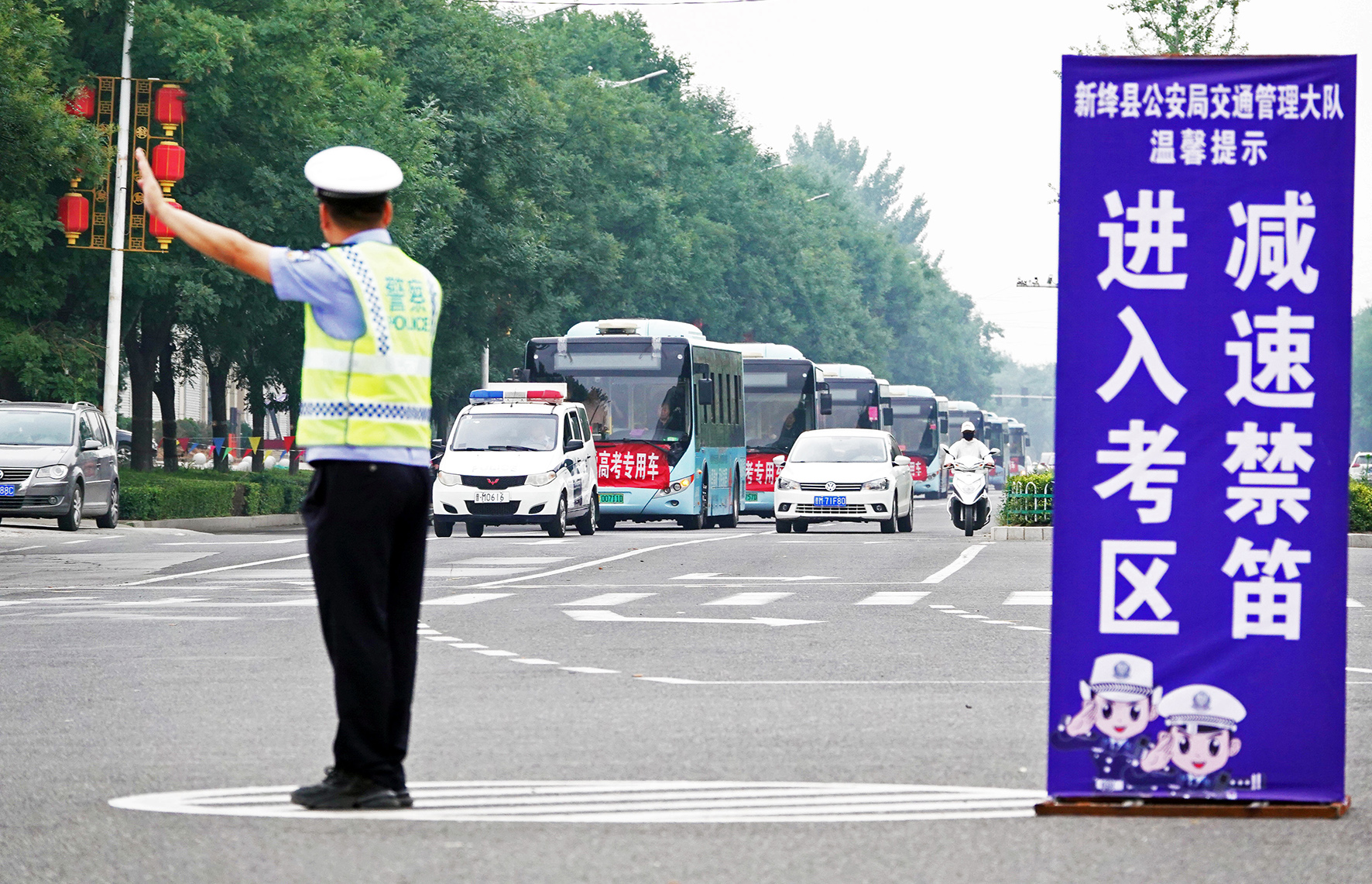6月7日,山西省運城市新絳縣公安局交警大隊民警指揮考生接送車有序進入新絳中學考區(qū)。