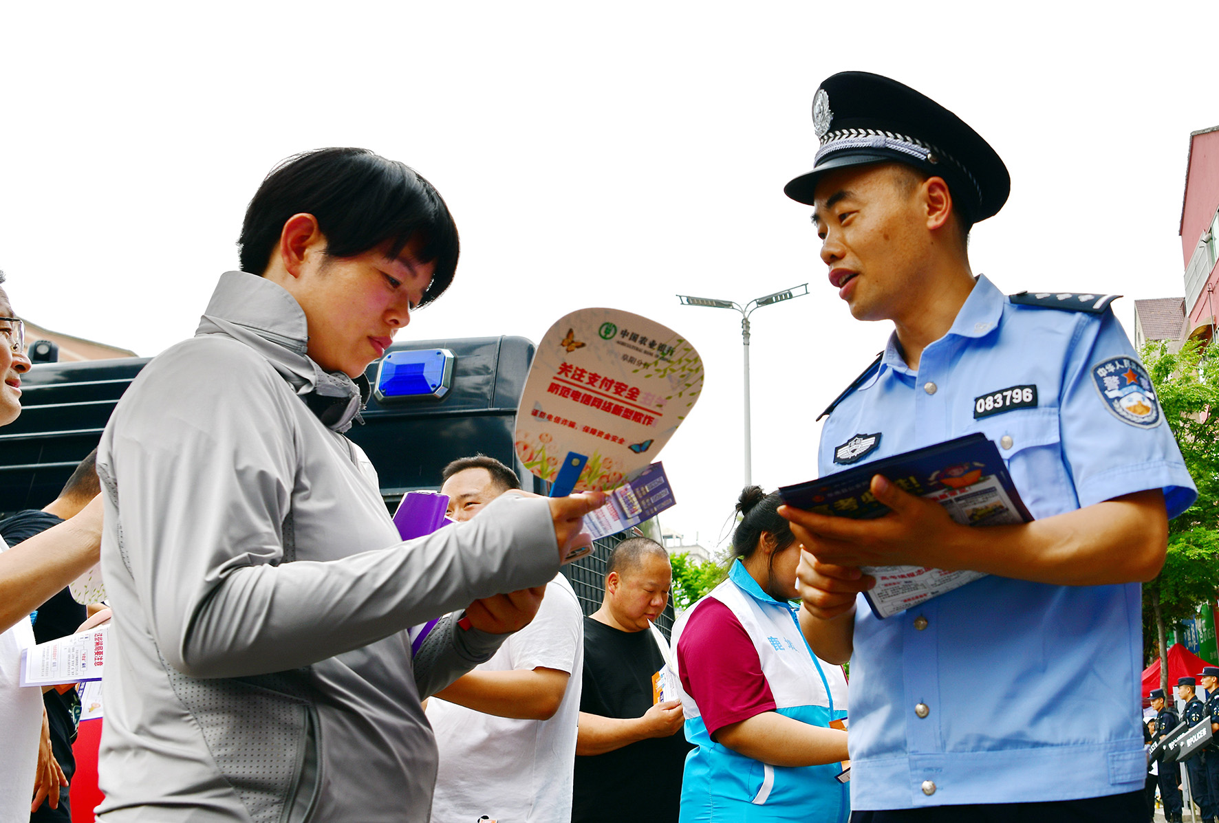6月8日,安徽省阜南縣公安局反電詐中心民警在一高考點附近向陪考家長宣講防范高考招錄詐騙常識。