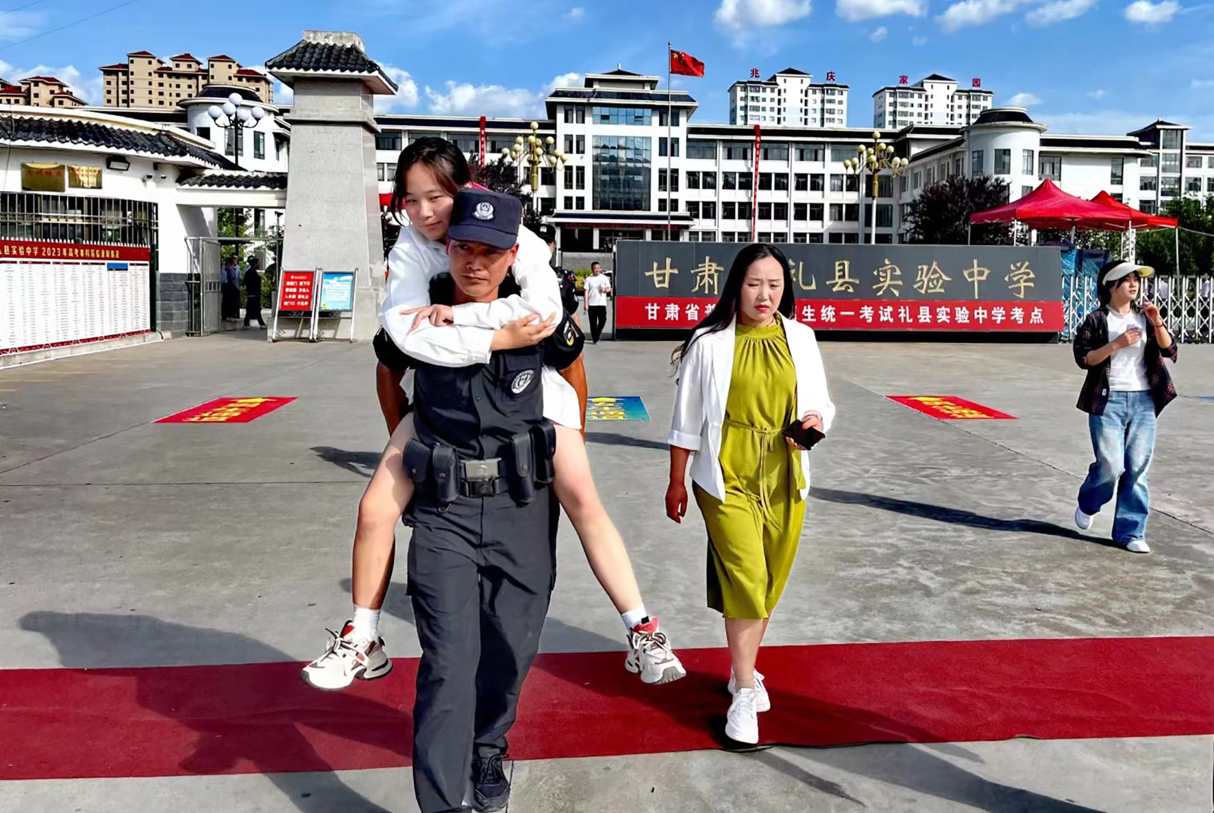 6月7日,甘肅省禮縣公安局特巡警在實驗中學考點護送一位行走不便的考生走出考場。