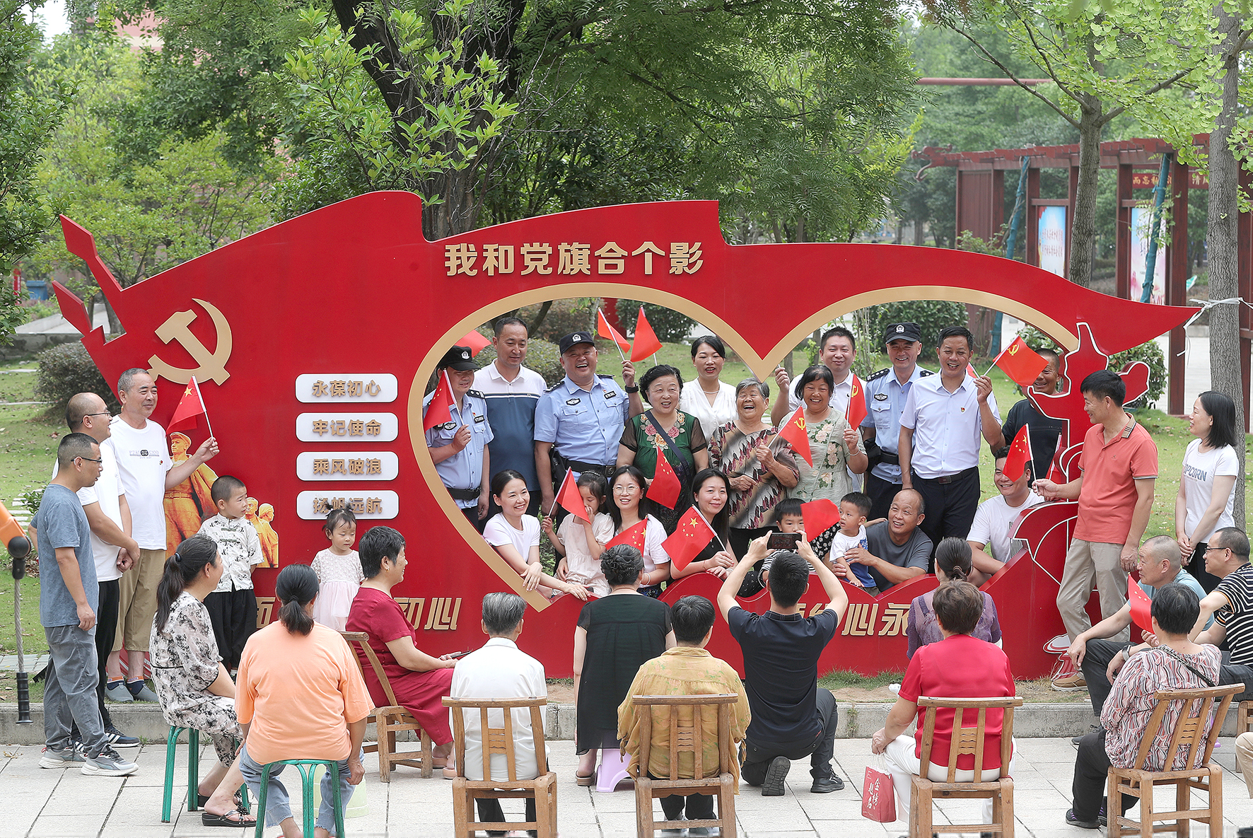 7月1日,湖北省荊門市公安局東寶分局荊泉派出所民警與新橋村老黨員、入黨積極分子及小區(qū)居民,以“我和黨旗合個影”送祝福的方式慶祝中國共產黨成立103周年。