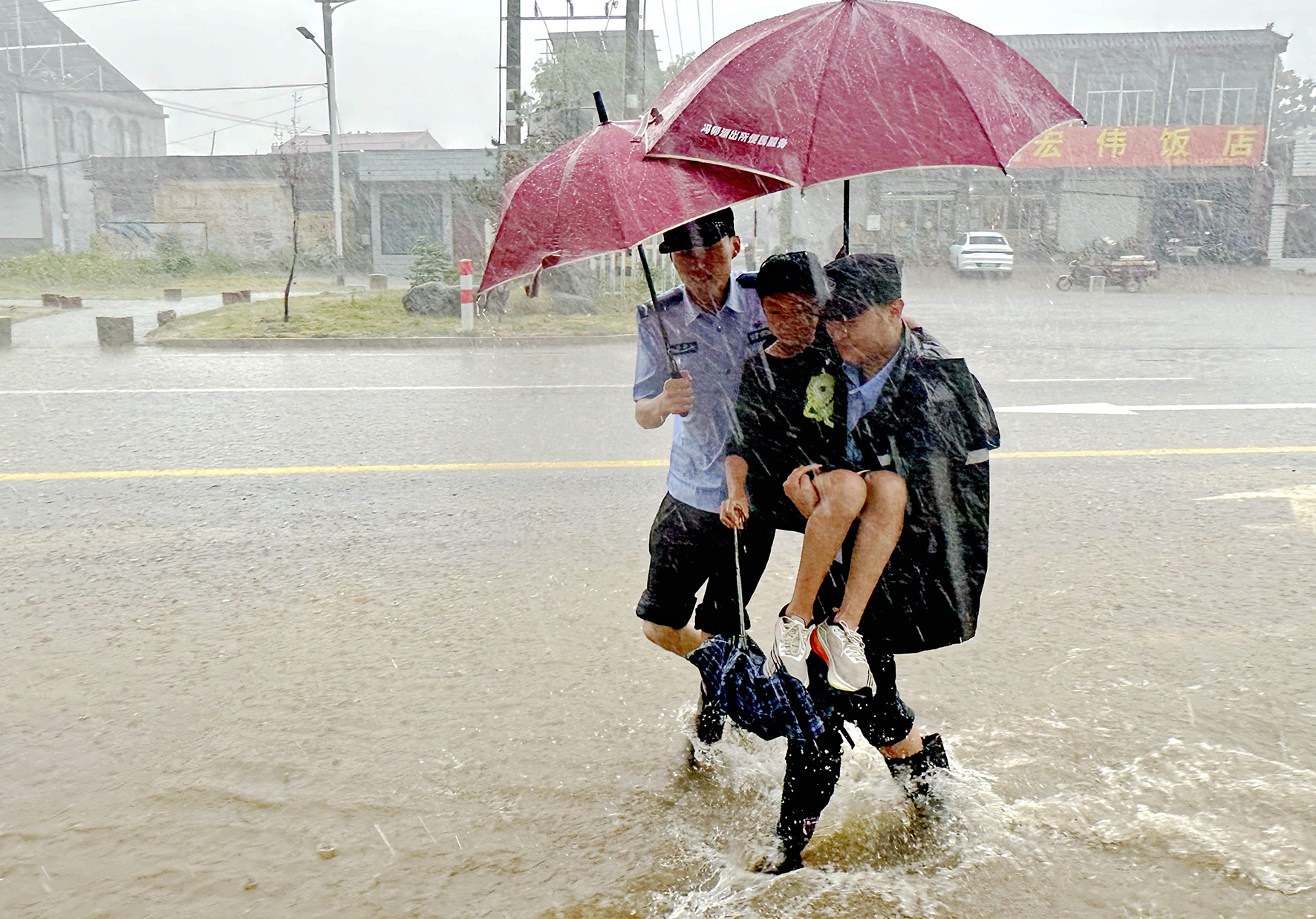 7月1日,山東省棗莊市公安局山亭分局馮卯派出所民輔警冒著暴雨將一名被困兒童安全護(hù)送到家。