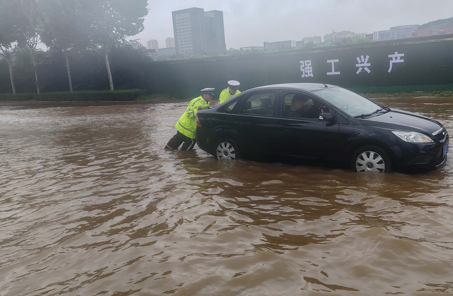 7月8日,山東省棗莊市公安局高新交警大隊(duì)民輔警在轄區(qū)積水嚴(yán)重路段幫助被困車輛脫險。
