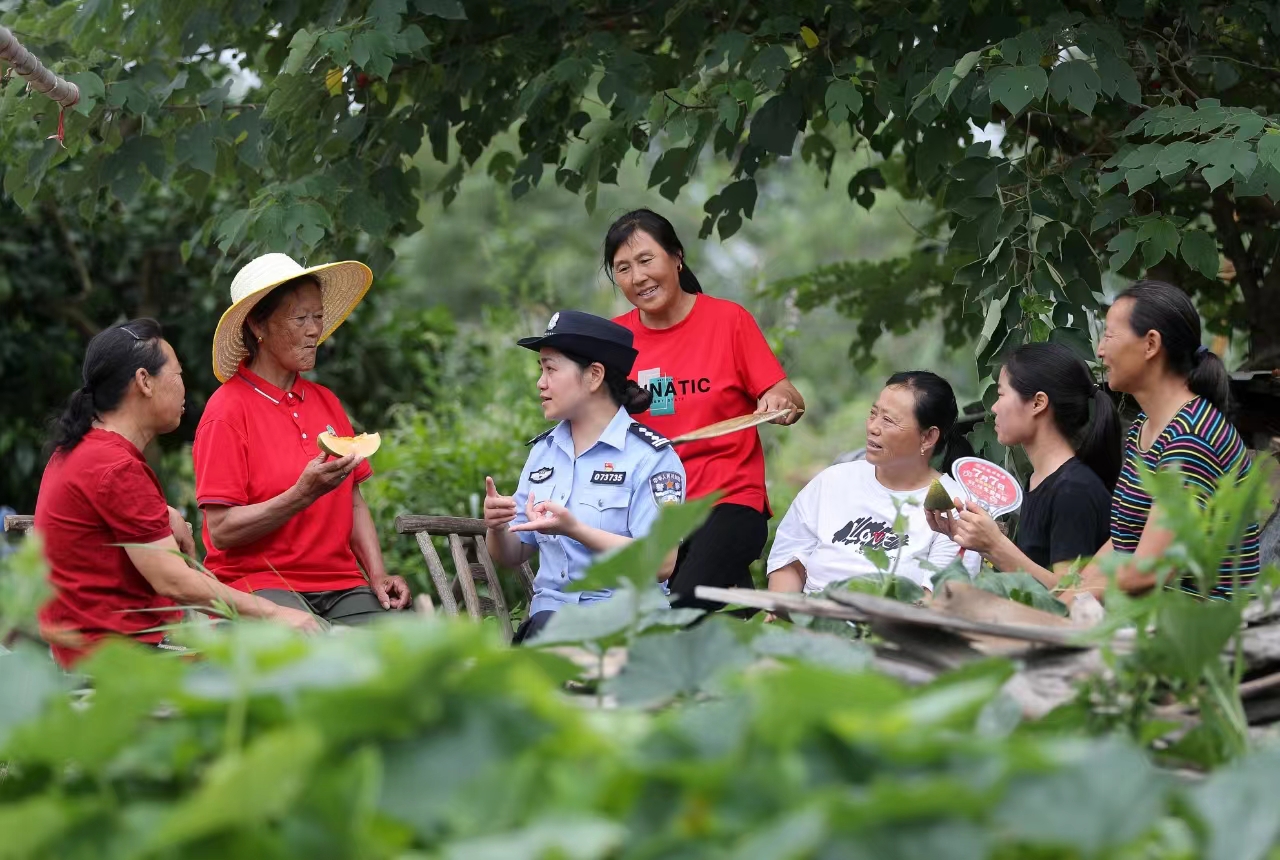 7月9日,在湖北省沙洋縣曾集鎮(zhèn)龔廟村,沙洋縣公安局女警向村民進(jìn)行未成年人防溺水、反詐、禁毒普法宣傳,對(duì)空巢老人和婦女兒童開展巾幗志愿服務(wù)。
