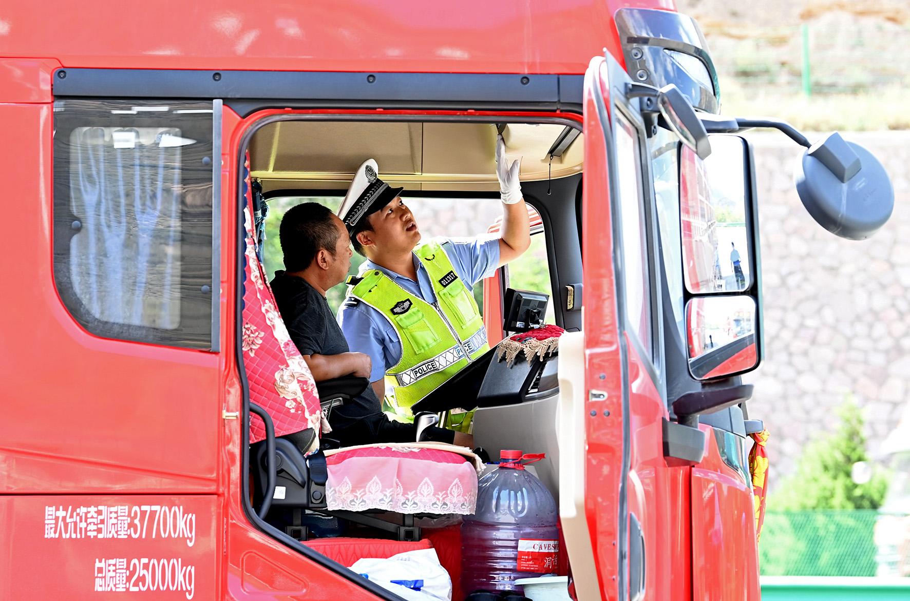 7月31日,甘肅省蘭州市公安局交警支隊民警在蘭海高速蘭臨段聯(lián)防聯(lián)控交管站,對過往三軸以上的大貨車逐車進行登記檢查,提醒駕駛?cè)藝栏褡袷馗唢L險路段規(guī)定,注意防范高溫天氣,切勿疲勞駕駛。