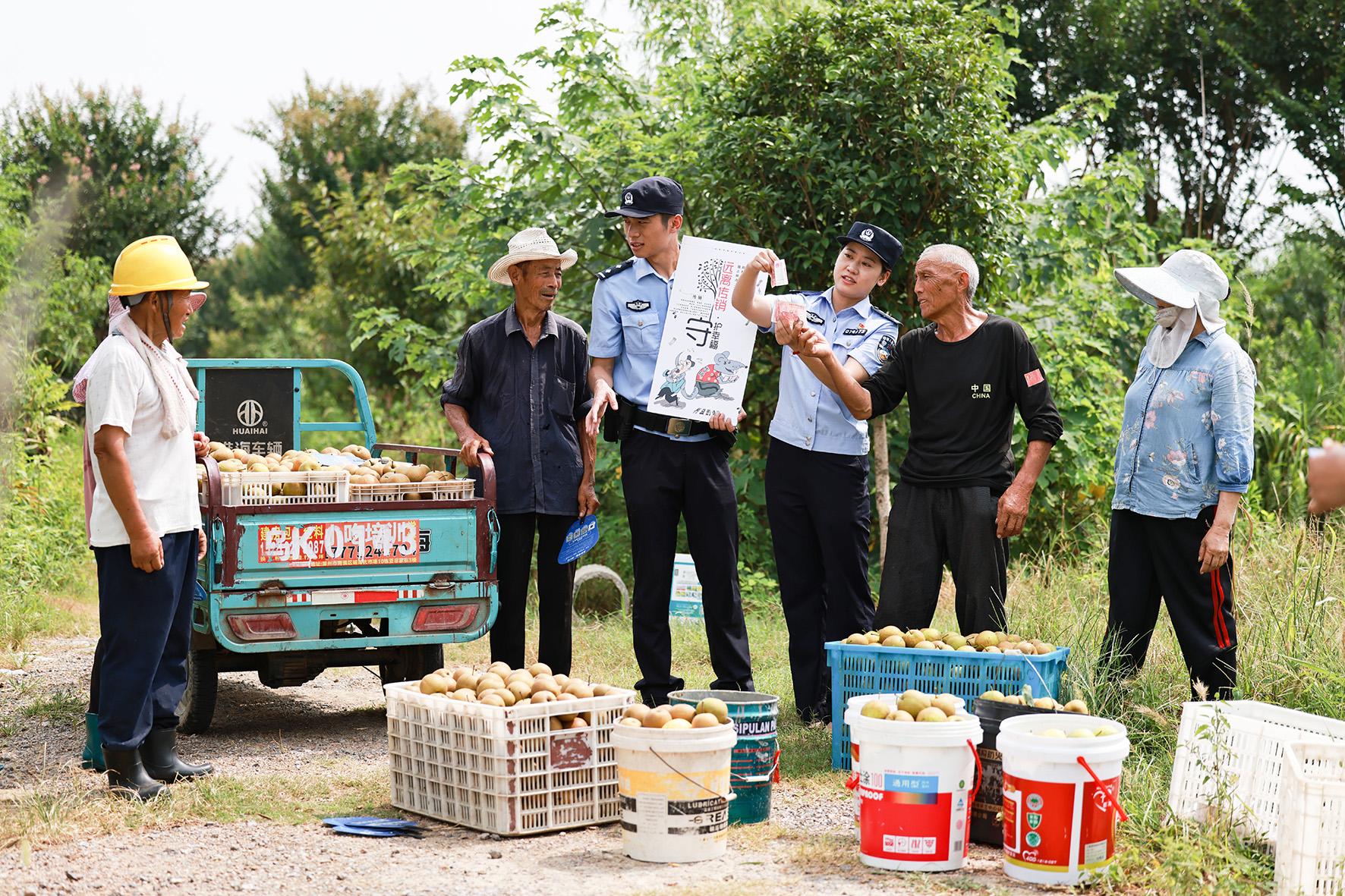 8月14日,安徽省和縣公安局經(jīng)偵大隊(duì)民警走進(jìn)果園,向果農(nóng)們講解經(jīng)濟(jì)犯罪的常見類型和手段,提醒果農(nóng)們在果品銷售、合作經(jīng)營等經(jīng)濟(jì)活動(dòng)中要保持警惕,避免落入陷阱。