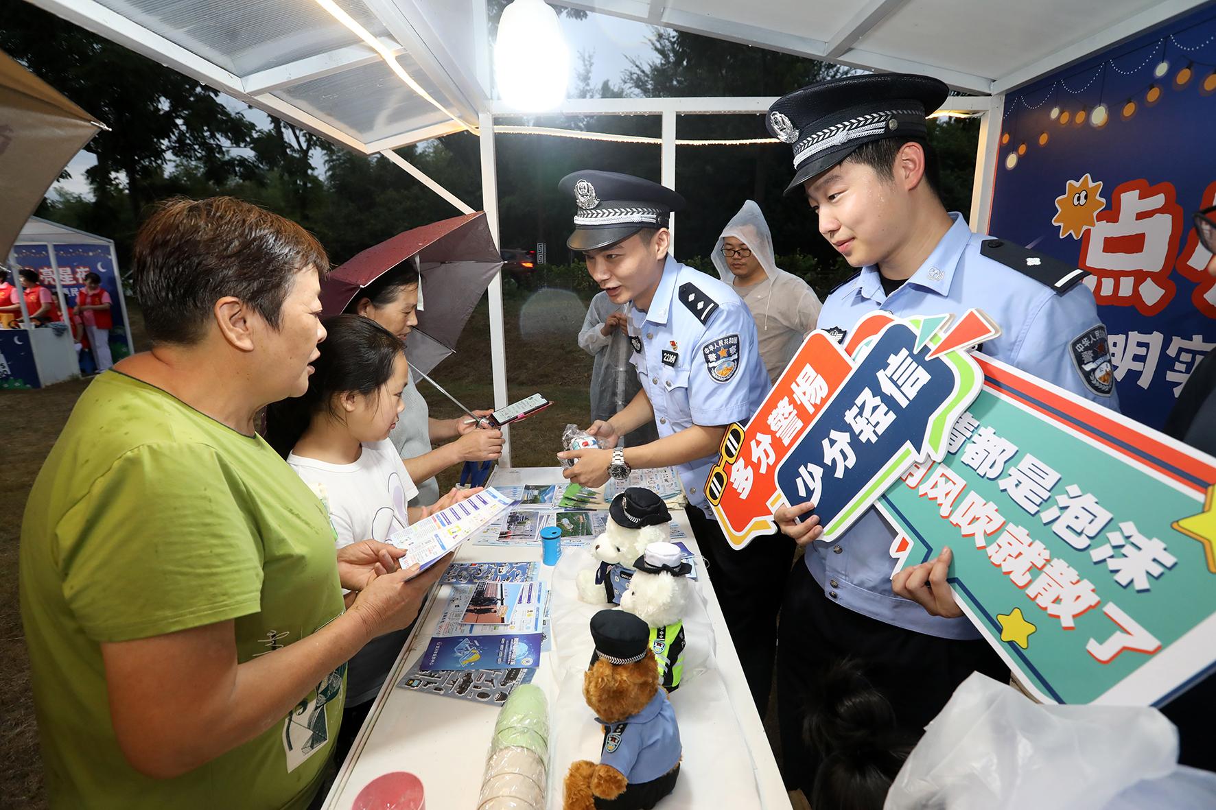 8月19日,江蘇省宜興市公安局太華派出所民警在“點亮星夜”文明實踐惠民夜集活動現場向群眾講解反詐和禁毒知識,提高群眾防騙和禁毒意識。