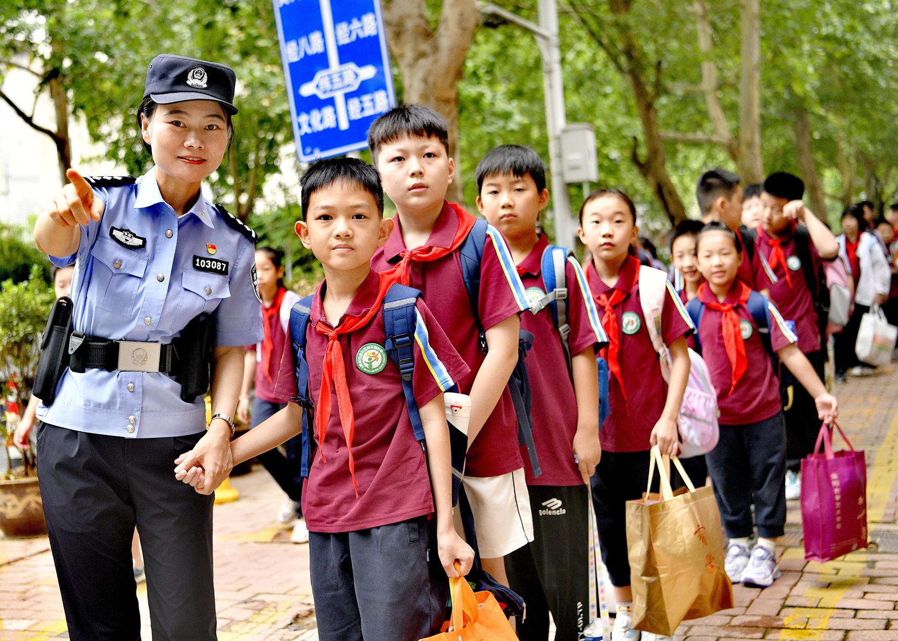 8月26日,河南省鄭州市中小學(xué)開(kāi)學(xué)第一天。鄭州市公安局金水分局經(jīng)八路派出所民輔警在轄區(qū)緯三路小學(xué)站好護(hù)學(xué)崗,服務(wù)校園師生。