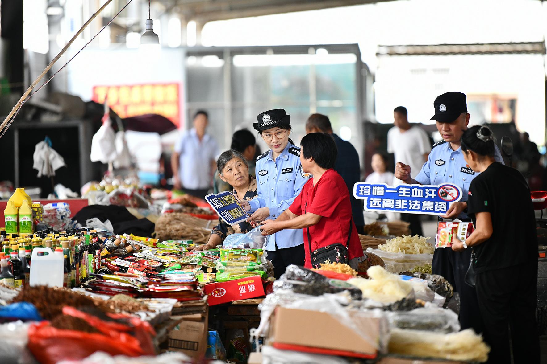 8月27日,安徽省阜南縣公安局民警在農(nóng)貿(mào)市場向群眾宣講養(yǎng)老詐騙、非法集資、經(jīng)營式傳銷等經(jīng)濟(jì)犯罪的手段和危害性。
