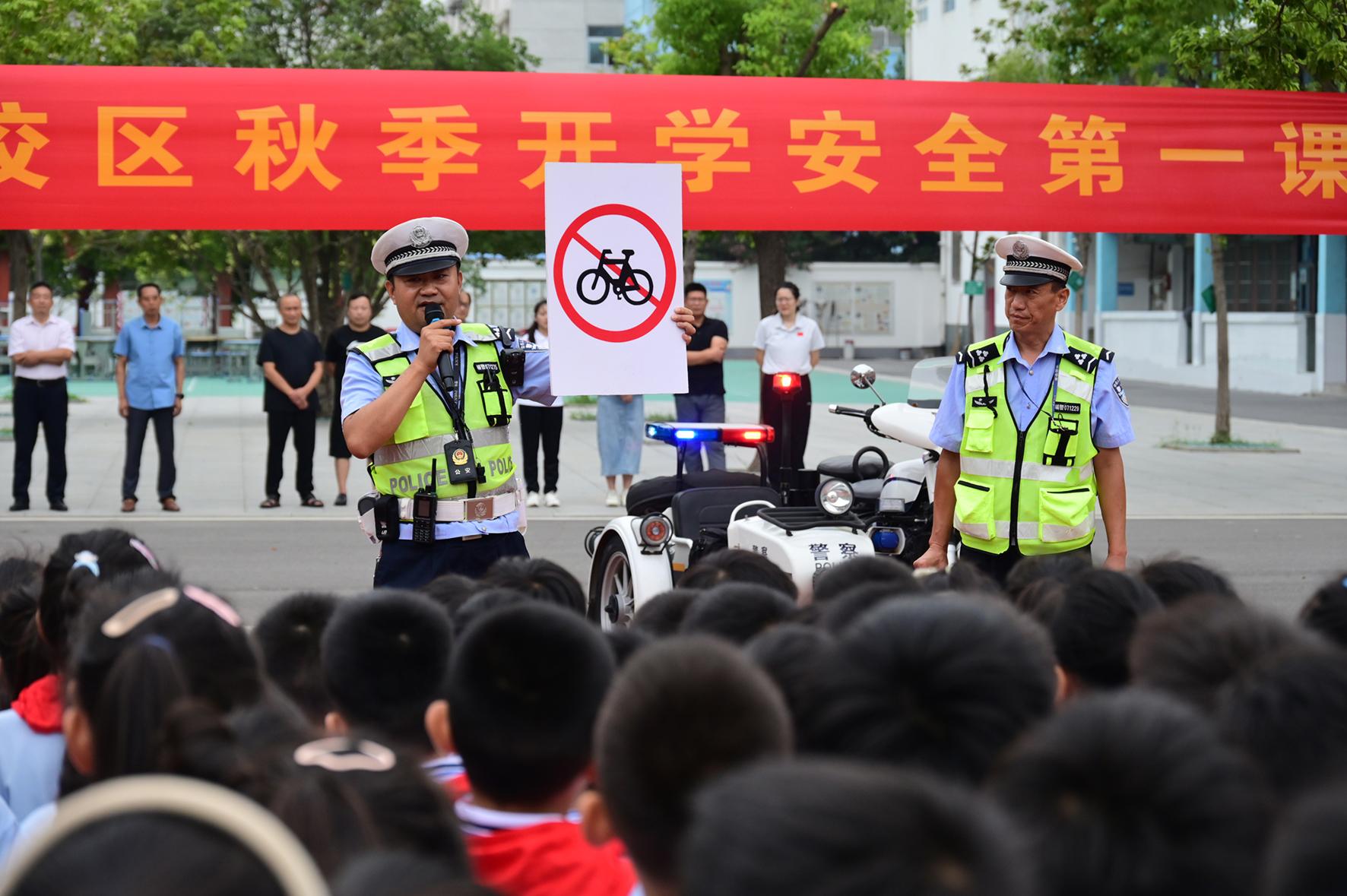 9月2日,安徽省阜南縣公安局交管大隊(duì)民輔警走進(jìn)轄區(qū)中小學(xué)校,開展“知危險(xiǎn)、避危險(xiǎn)”交通安全開學(xué)第一課活動(dòng)。