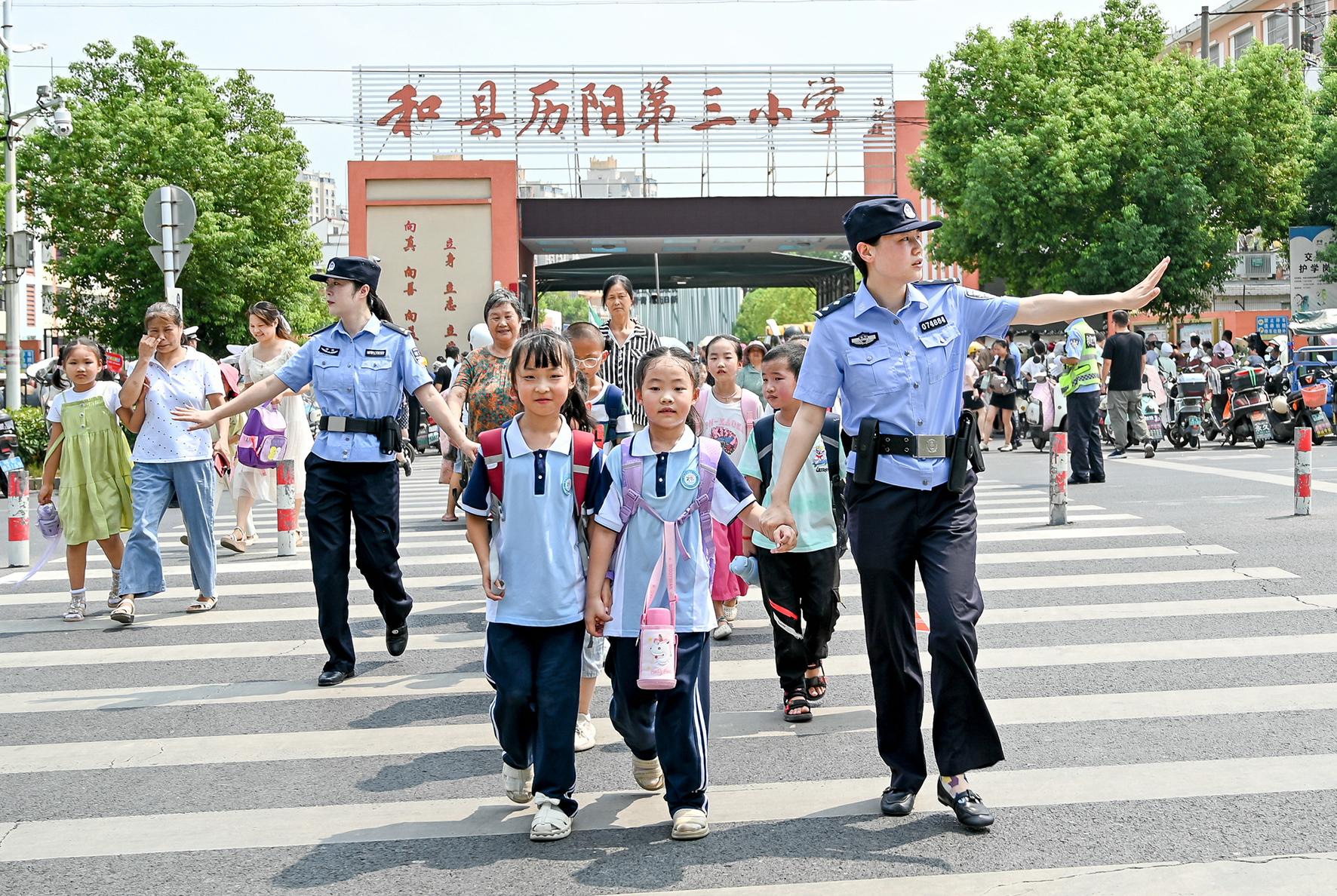 9月2日,安徽省馬鞍山市和縣公安局“校園護(hù)學(xué)崗”民警正在歷陽(yáng)鎮(zhèn)第三小學(xué)護(hù)送學(xué)生安全過(guò)馬路。