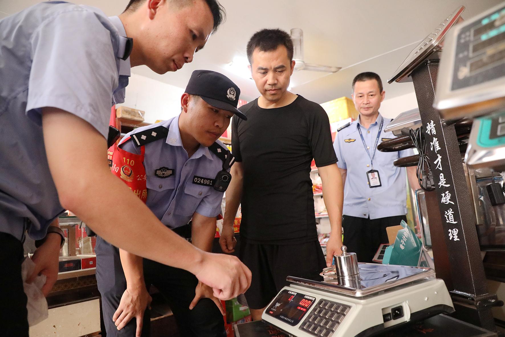 9月2日,江西省九江市公安局潯陽(yáng)分局金雞坡派出所民警輔警聯(lián)合市場(chǎng)監(jiān)管部門(mén)工作人員深入轄區(qū)電子秤銷(xiāo)售門(mén)店及農(nóng)貿(mào)市場(chǎng)、超市、流動(dòng)攤點(diǎn)等,開(kāi)展電子秤專(zhuān)項(xiàng)檢查行動(dòng)。