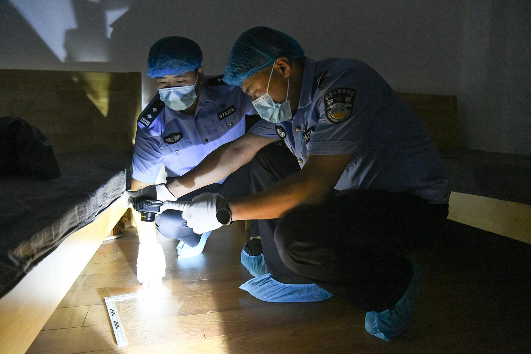 圖為刑事技術民警分析提取入室盜竊犯罪現(xiàn)場足跡。