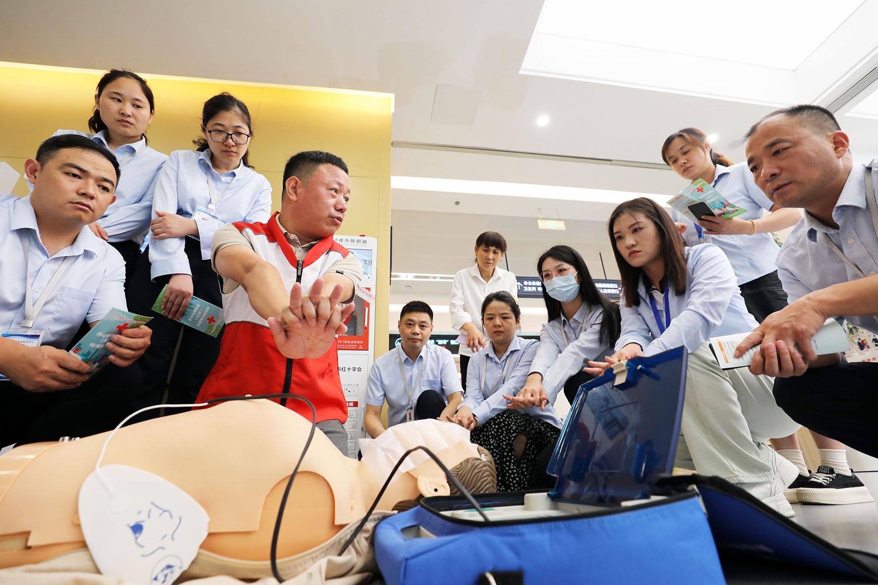 9月14日,是“世界急救日”。在安徽省淮北市政務(wù)服務(wù)中心,淮北市紅十字會志愿者向工作人員講解如何使用AED(自動體外除顫器)和演示急救設(shè)備的操作方法。